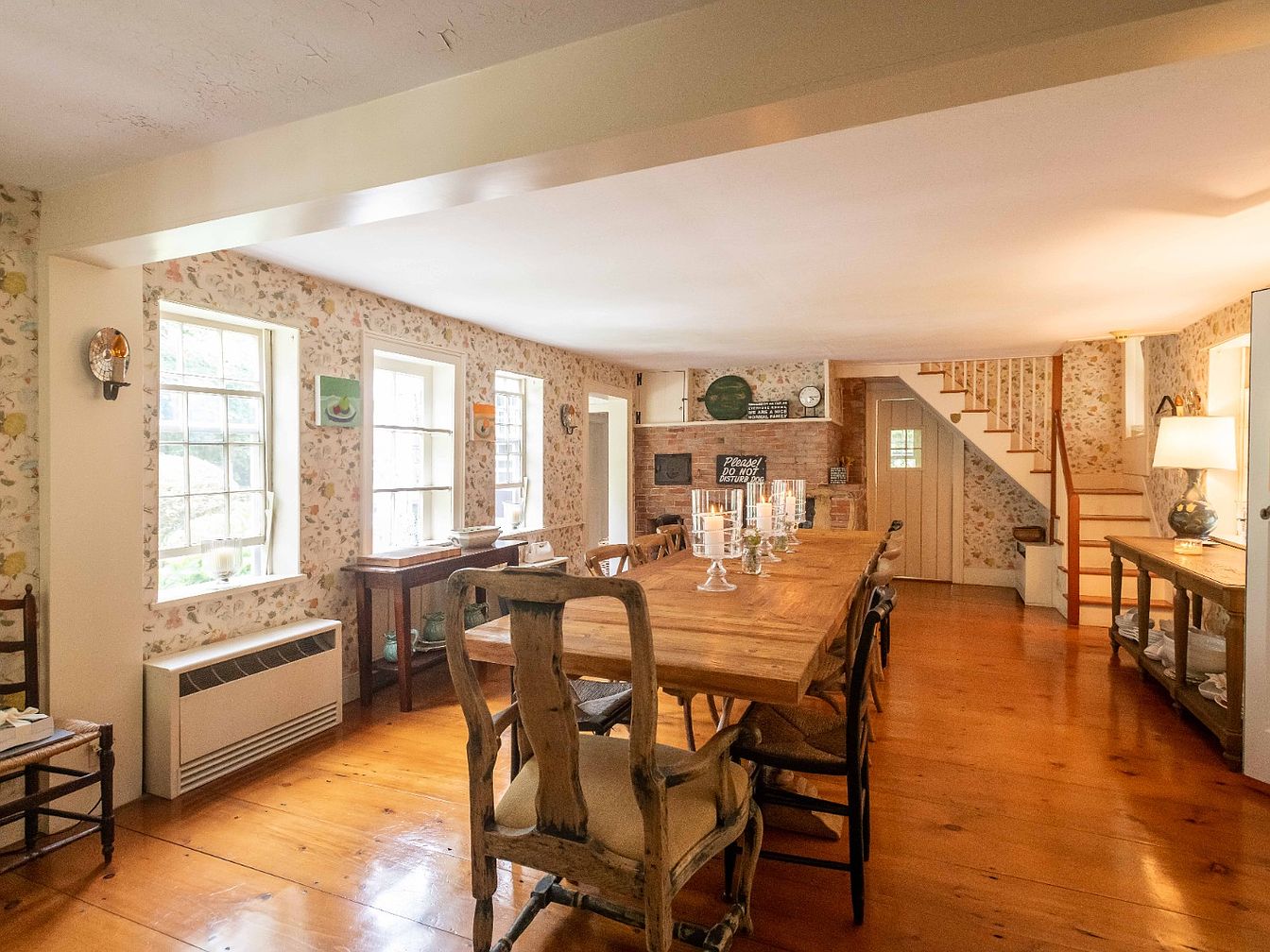 A long wooden dining table commands the center of this spacious room, comfortably seating a large family or guests for gatherings. Warm, honey-toned hardwood floors contrast beautifully with the soft, floral-patterned wallpaper, creating a cozy and inviting ambiance. Natural light pours in through a row of generous windows, highlighting rustic chairs and subtle decorative accents, including elegant candle holders and eclectic wall art. An open layout seamlessly flows to a staircase tucked into one corner, while a sturdy sideboard and console table add functional storage. The room strikes a balance between country charm and practical comfort, perfect for family meals and celebrations.