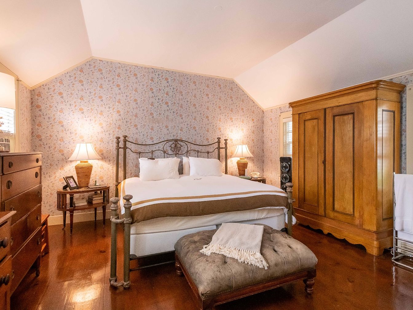A charming master bedroom featuring a warm and inviting layout, perfect for relaxation and comfort. The iron bed frame stands as the centerpiece, complemented by crisp white bedding and a tan throw for added coziness. Floral-patterned wallpaper lends a subtle vintage touch, while honey-hued hardwood floors and matching wooden furniture, like the armoire and dresser, create a cohesive, classic look. Soft, ambient lighting from twin bedside lamps and decorative accents such as a tufted ottoman and framed photos enhance the homely, family-friendly atmosphere. The room’s traditional décor and ample storage make it both functional and beautifully timeless.