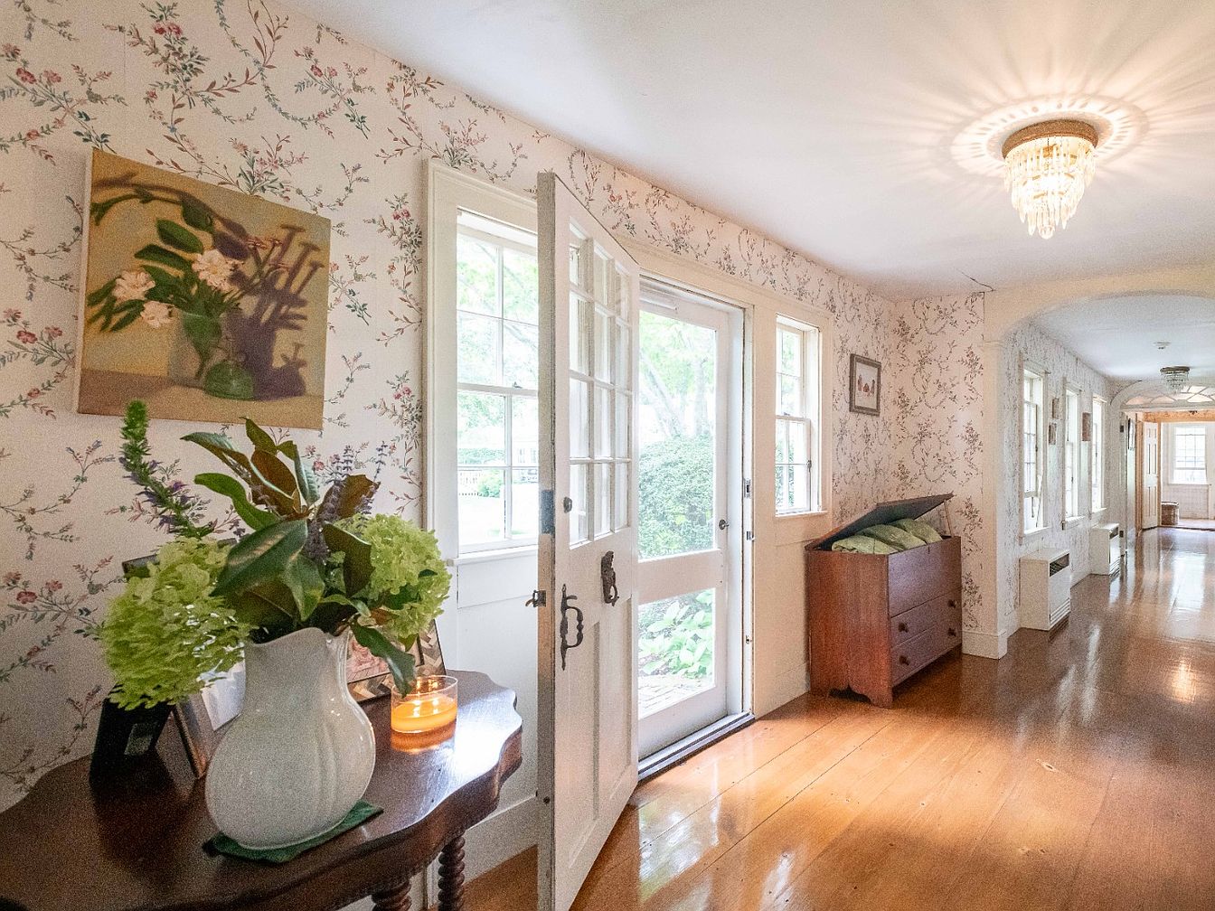 Bright and welcoming, the entryway hallway boasts beautiful floral wallpaper that creates a cheerful, classic ambiance perfect for a family home. Natural light pours through large windows and a glass-paneled door, illuminating the honey-toned wooden floors. A small side table displays fresh flowers in a white ceramic vase and framed photos, evoking a personal touch. Storage is thoughtfully addressed with a wooden bench, perfect for stowing family essentials like shoes or bags. Crystal ceiling fixtures add a touch of elegance, while wide, uncluttered walkways make it easy for everyone to move in and out, supporting both style and function.