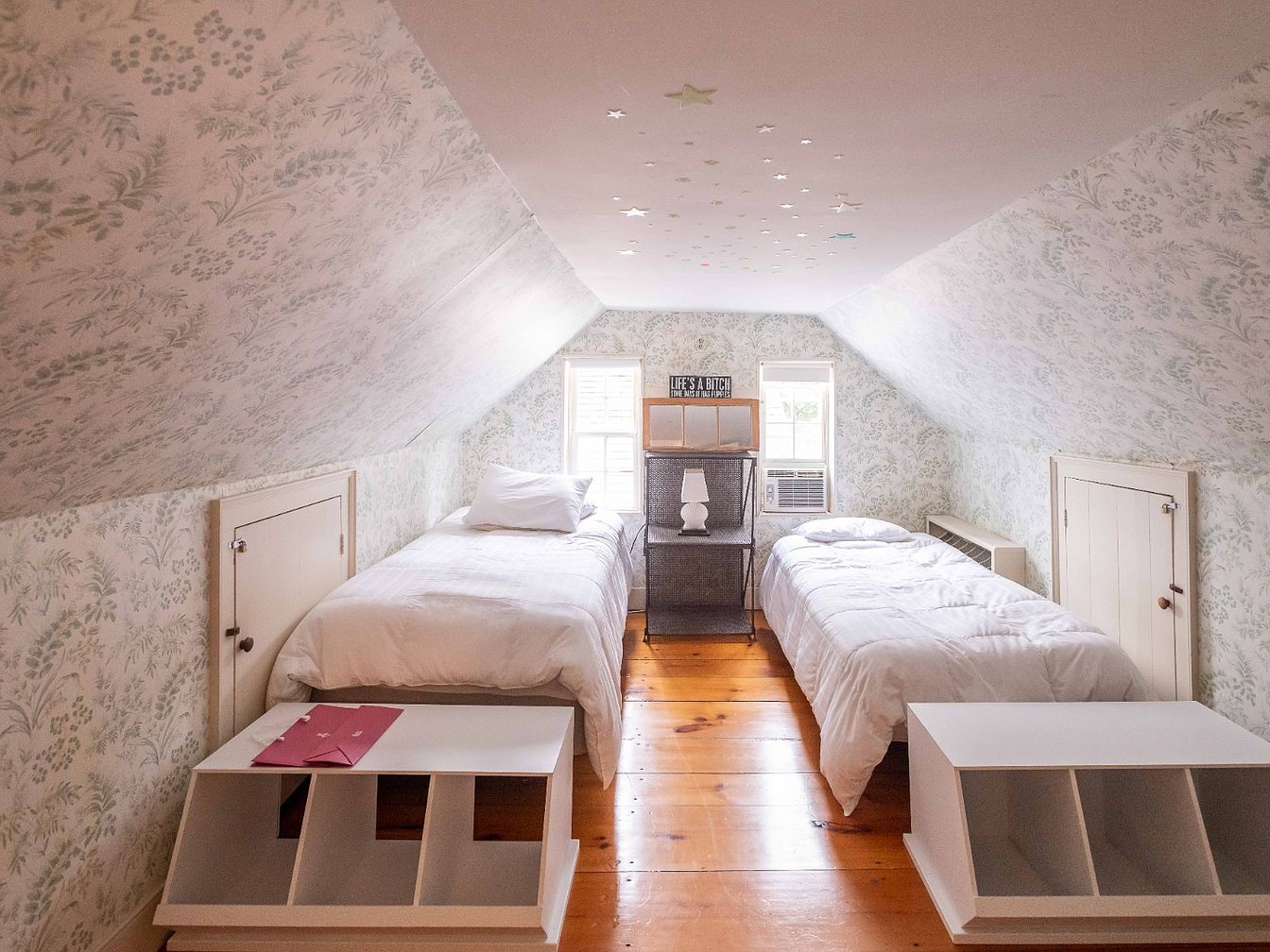 A charming attic bedroom offers a delightful retreat for children, featuring two twin beds with crisp white bedding arranged side-by-side beneath sloped ceilings. Delicate floral-patterned wallpaper envelops the room, creating a soft, whimsical atmosphere. The wooden floors add warmth and character, while white cubby storage at the foot of each bed provides practical space for toys or books. Small closet doors built into the angled walls offer extra storage, making the space both functional and child-friendly. Playful glow-in-the-dark stars dot the ceiling, encouraging imagination, while two windows flood the room with natural light, making it bright and inviting.