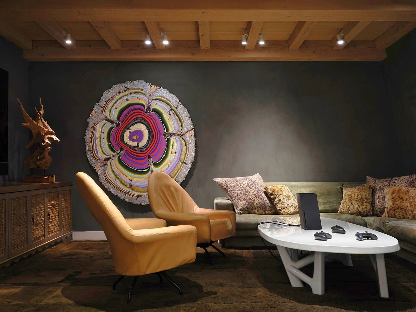 This cozy living room balances rustic charm with modern flair, featuring an open wood-beamed ceiling for a warm, welcoming ambiance. The muted, olive-gray walls set a calming backdrop, while a stunning large-scale, multi-colored circular wall art piece becomes the visual centerpiece. A sleek sectional sofa occupies one side, adorned with textured, family-friendly pillows in earth and pastel tones. Two inviting butter-yellow lounge chairs offer additional seating, ideal for relaxation or family gatherings. The contemporary white coffee table doubles as a gaming station, with controllers on display, making this space perfect for both entertaining and spending quality time together.
