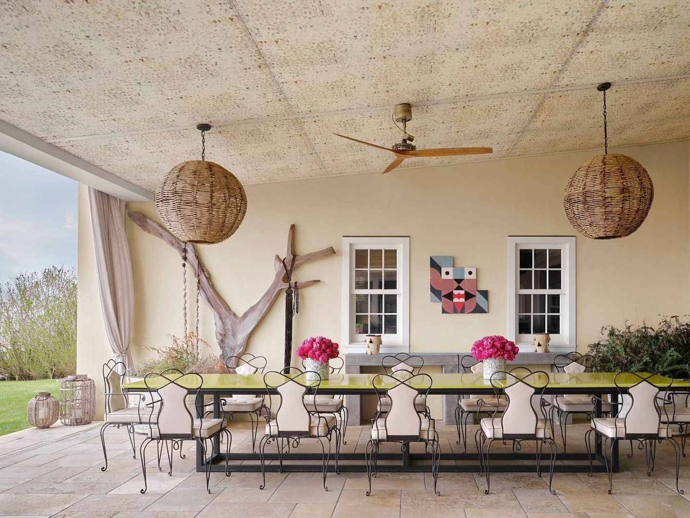 A spacious covered patio dining area perfect for family gatherings or entertaining friends. The long rectangular table, adorned with pink peonies, is surrounded by elegant wrought iron chairs with soft, cream-colored cushions offering comfort and style. The ceiling features warm, rustic wicker pendant lights and a wooden ceiling fan for added breeze on warm days. Earthy tones combine with natural textures, such as the stone floor and decorative driftwood art on the wall, to create a cozy, inviting ambiance. Two modern windows and quirky wall art add a playful charm, while the open layout encourages easy indoor-outdoor living.