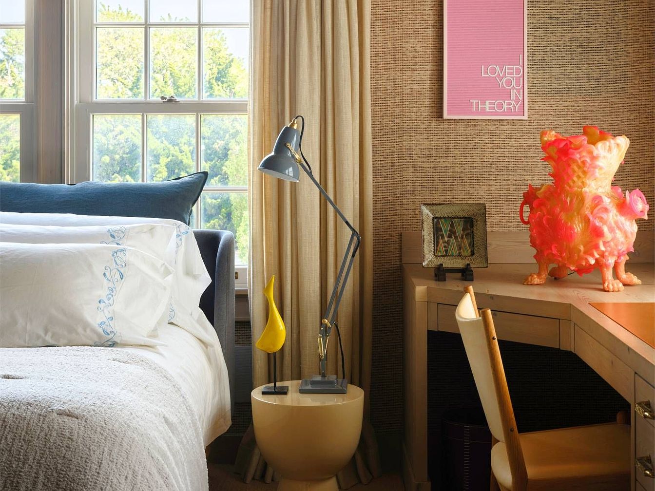 A cozy nook in a bedroom seamlessly blends sleep and productivity, featuring a soft upholstered bed with crisp white linens embroidered in blue for a fresh, inviting look. Beside the bed, a sleek yellow side table holds a modern desk lamp and vibrant vase, bringing warmth and playful color. Large windows flood the space with natural light, softened by beige curtains, while a neutral, textured wall adds depth. The built-in wooden desk and simple chair provide a family-friendly workspace perfect for homework or creative projects, accented with fun decor like a whimsical sculpture and an inspirational pink art piece.
