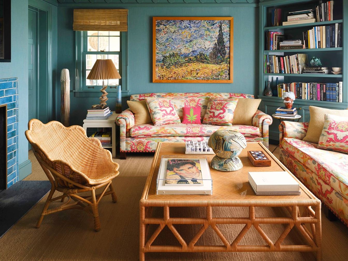This inviting living room features tranquil blue walls and built-in shelves filled with books, making it perfect for family gatherings or quiet reading sessions. Two large, floral-patterned sofas and cozy, neutral pillows add a playful touch and provide ample, comfortable seating for all ages. A unique wicker chair and matching coffee table introduce a natural, textured element, while the soft, woven rug anchors the space and is gentle for children to play on. Bright artwork and a blue-tiled fireplace create focal points, while natural light streams in through bamboo blinds, contributing to the cheerful, family-friendly atmosphere.
