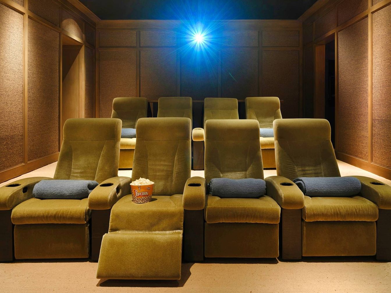 This inviting home theater features three rows of plush olive-green reclining seats, each equipped with individual cup holders and cozy charcoal gray blankets, ensuring comfort for every family member. The warm, caramel-toned wall panels provide excellent acoustic insulation and complement the muted beige carpeting, creating a cozy, cinematic ambiance. The projector, mounted discreetly above, casts a vibrant glow, promising an authentic movie experience. Wide aisles between the seats allow easy access, making the room accessible for both adults and children, while the clean, uncluttered design ensures the focus stays on entertainment and family togetherness.