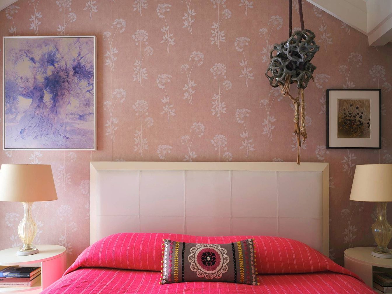 A stylish bedroom features a soft palette with a pink floral-patterned wallpaper that lends a gentle, comforting atmosphere, perfect for a family home. The sleek, padded white headboard sits against this patterned wall, while a vibrant red striped bedspread with a decorative pillow injects playful color. On either side of the bed, matching round nightstands hold elegant glass lamps, creating a symmetrical and inviting layout. Artistic touches include framed wall art that adds character, as well as a unique sculptural hanging piece above the bed, blending personal style with cozy warmth, making the space ideal for relaxation and togetherness.