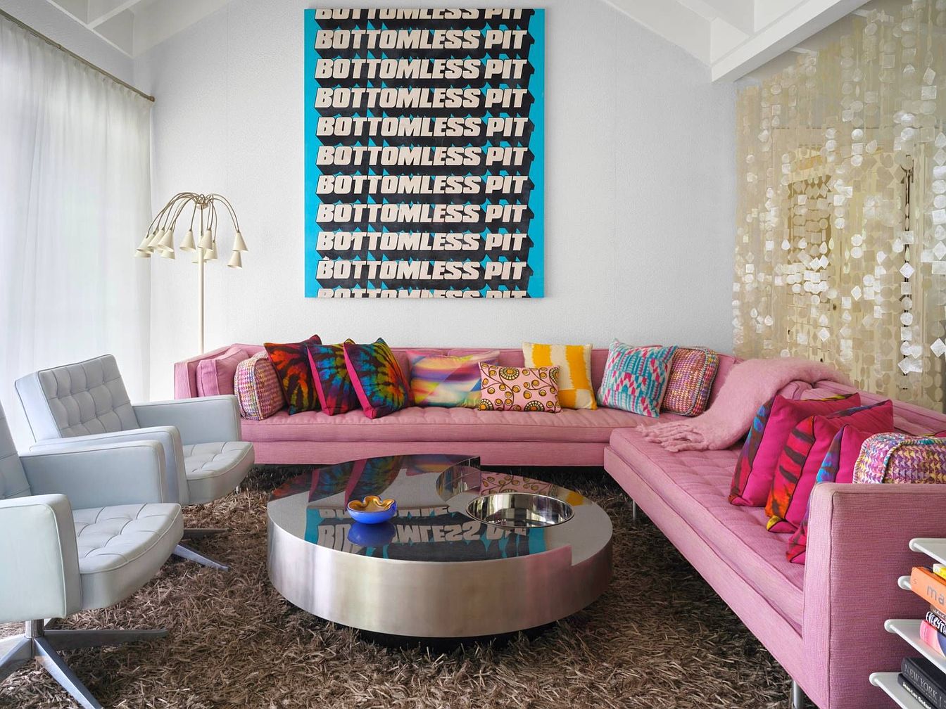 A vibrant living room corner features a large, U-shaped pink sectional sofa filled with bright, patterned throw pillows for a playful, inviting atmosphere perfect for families. Two pale modern armchairs and a plush, textured brown rug add both extra seating and comfort for gatherings or relaxing. An eye-catching round metallic coffee table anchors the space, while a bold, graphic art piece and shimmering wall accents infuse personality. Soft, sheer curtains diffuse natural light, creating a welcoming environment that accommodates entertaining guests or family lounging. The mix of colors, tactile surfaces, and seating arrangements highlights both style and functionality for all ages.