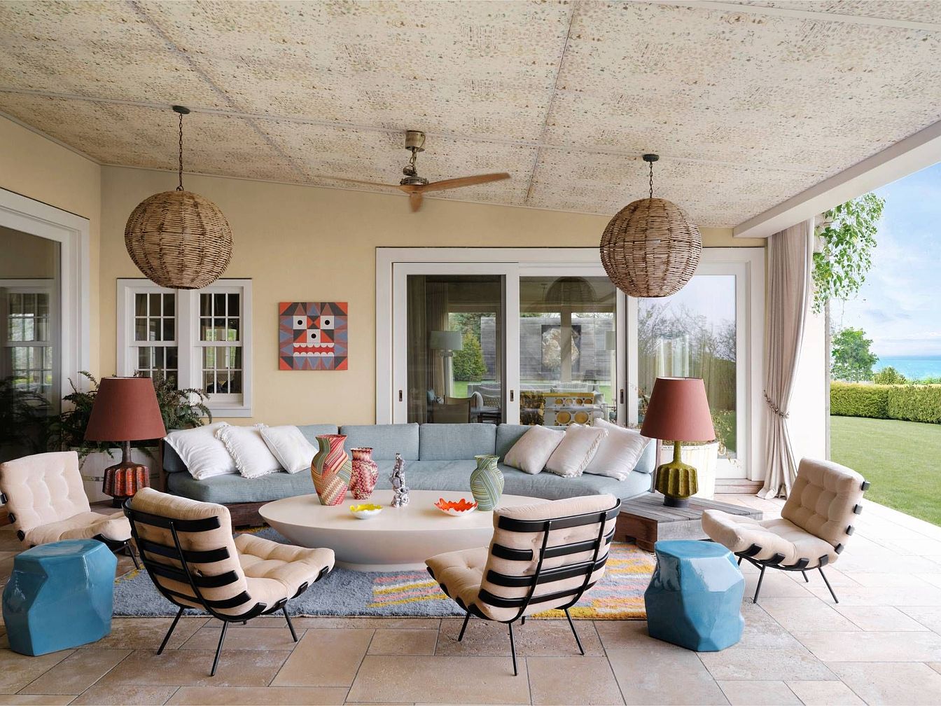 A welcoming covered patio invites relaxation with a spacious, curved light-blue sectional sofa lined with plush white cushions, perfect for families or gatherings. The seating arrangement centers around a modern, round coffee table accented by colorful vases and decorative objects. Four tufted armchairs in soft cream offer additional seating, paired with geometric blue side tables for a playful touch. The space features warm beige walls and a light, speckled ceiling, complemented by woven pendant lights and large sliding glass doors that connect to a lush green lawn. Fun artwork and textured rugs add charm, making the area vibrant yet comfortable for all ages.