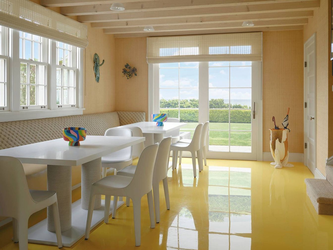 A spacious breakfast nook, ideal for families, features bright yellow glossy floors that reflect natural light streaming through large windows and a set of glass doors opening to a lush green yard. The cozy built-in banquette runs along the wall, providing ample seating for children and guests. Sleek white tables and modern chairs are arranged for casual dining or family gatherings, complemented by colorful decorative bowls that add a playful touch. The neutral beige walls and exposed ceiling beams create a warm, inviting atmosphere. Functional window shades allow for adjustable daylight, and whimsical wall art completes this cheerful, welcoming space.