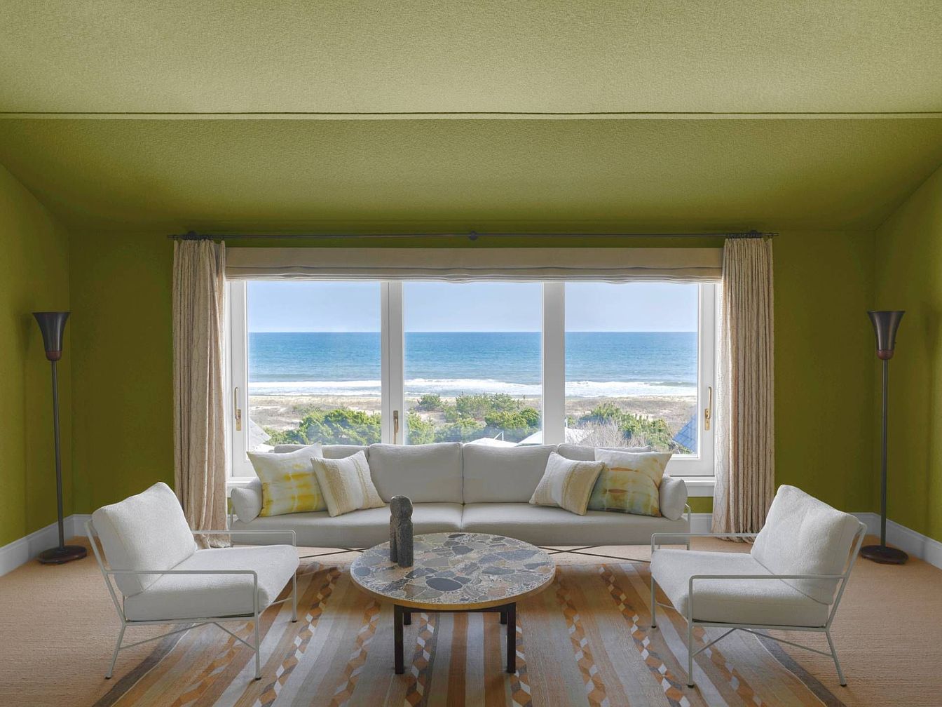 A serene living room designed for relaxation and togetherness, featuring a large picture window that frames the stunning ocean view and floods the space with natural light. The room is painted in a fresh olive green, creating a calming ambiance and a soft contrast to the blue sea outside. White cushioned armchairs and a sleek, modern sofa form a cozy conversation circle around a unique stone-topped coffee table. Neutral curtains and a beige rug with subtle patterns add warmth, while the uncluttered layout provides ample space for families to gather, play, or unwind, making it both stylish and practical.
