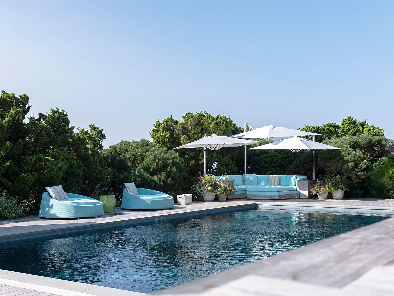 This inviting poolside lounge area is surrounded by lush greenery, creating a private and tranquil oasis perfect for family relaxation and outdoor fun. Spacious, cushioned seating in soft aqua tones creates a cohesive, friendly atmosphere with an abundance of room for gatherings. Large, modern umbrellas provide ample shade over the sectional sofa and side chairs, making it a comfortable retreat at any time of day. The clean lines of the furniture and paved deck lend a contemporary touch, while well-placed potted plants add a fresh burst of color and natural beauty, enhancing the family-friendly and welcoming feel of the space.