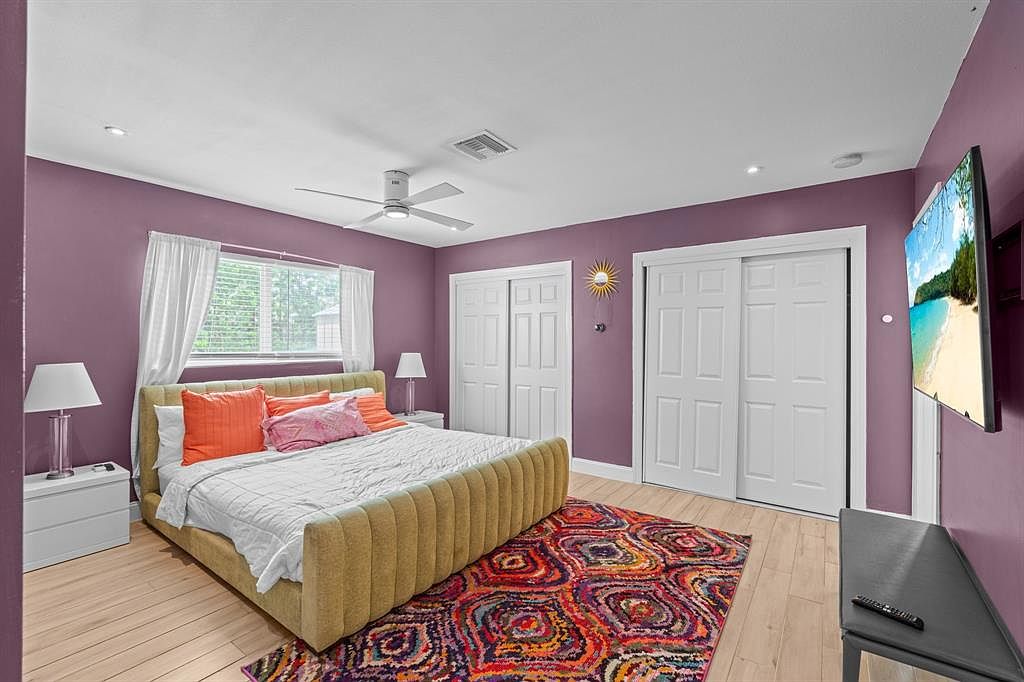 This modern master bedroom exudes comfort and style with its warm purple walls, creating a cozy yet vibrant atmosphere. The plush, tufted bed is adorned with colorful pillows in shades of orange and pink, harmonizing beautifully with the decor. Natural light floods the space through the window, enhancing the calming ambiance. Sleek white bedside tables and a stylish lamp provide functional elegance. A stunning area rug with a geometric pattern adds a playful touch to the room, while the mounted TV offers entertainment convenience. Dual closet doors blend seamlessly into the design, ensuring ample storage while maintaining a clean aesthetic.