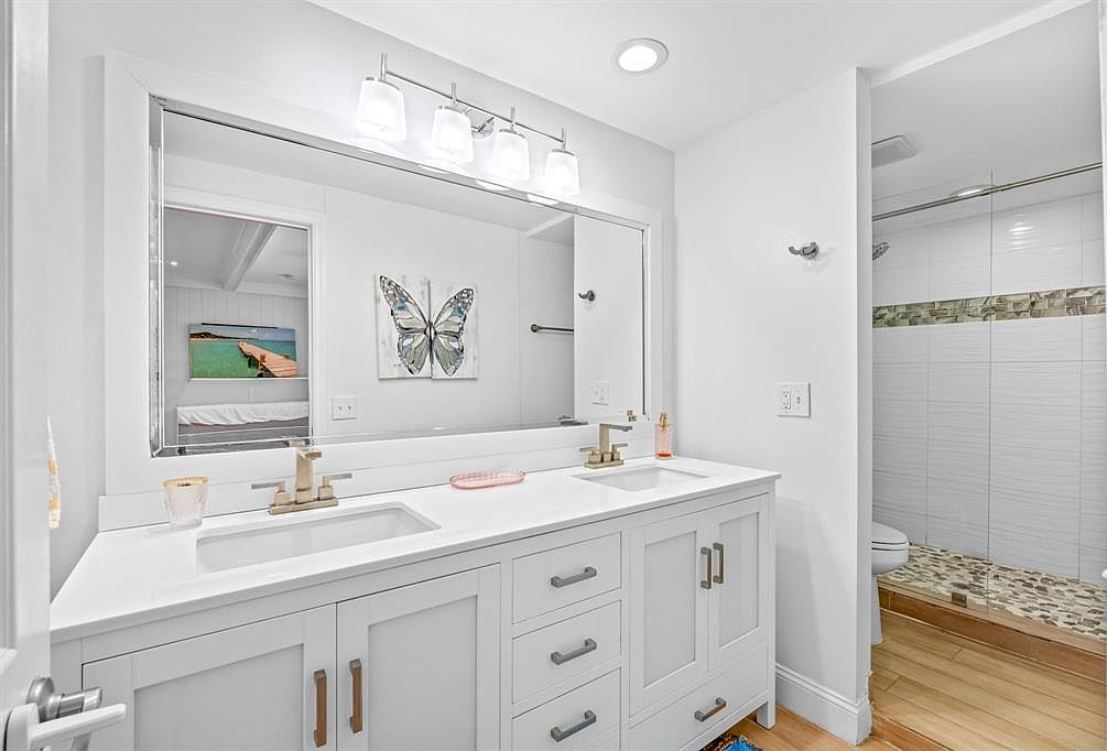 This serene bathroom combines functionality with modern design. A spacious double vanity boasts elegant brass fixtures, perfect for busy mornings. The large mirror reflects natural light, enhancing the airy feel. The color palette of crisp whites and soft neutrals creates a soothing atmosphere. A striking butterfly artwork adds a vibrant touch. Adjacent, a walk-in shower features contemporary tiles, including a unique mosaic accent band that ties in with the wooden flooring. Thoughtfully designed, the space encourages relaxation while offering ample storage and accessibility, making it ideal for families looking for both style and convenience in their daily routines.