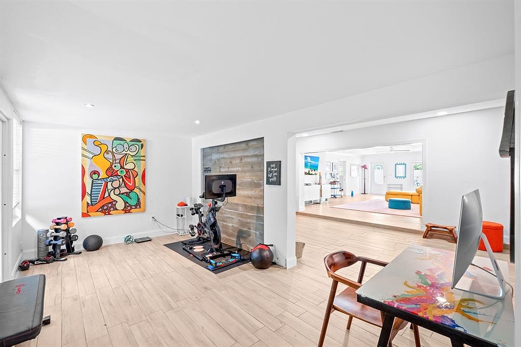 This inviting home gym features an open layout with abundant natural light pouring through large windows adorned with blinds, allowing for privacy while maintaining brightness. The warm, neutral color palette of the walls and the sleek wooden flooring create a calming atmosphere, perfect for a workout. Strategically placed equipment, such as a stationary bike and free weights, caters to fitness enthusiasts. A vibrant piece of artwork adds a pop of color, enriching the space visually. The adjacent door leads to a tranquil outdoor area, reinforcing the home’s connection to nature and providing space for relaxation post-exercise.