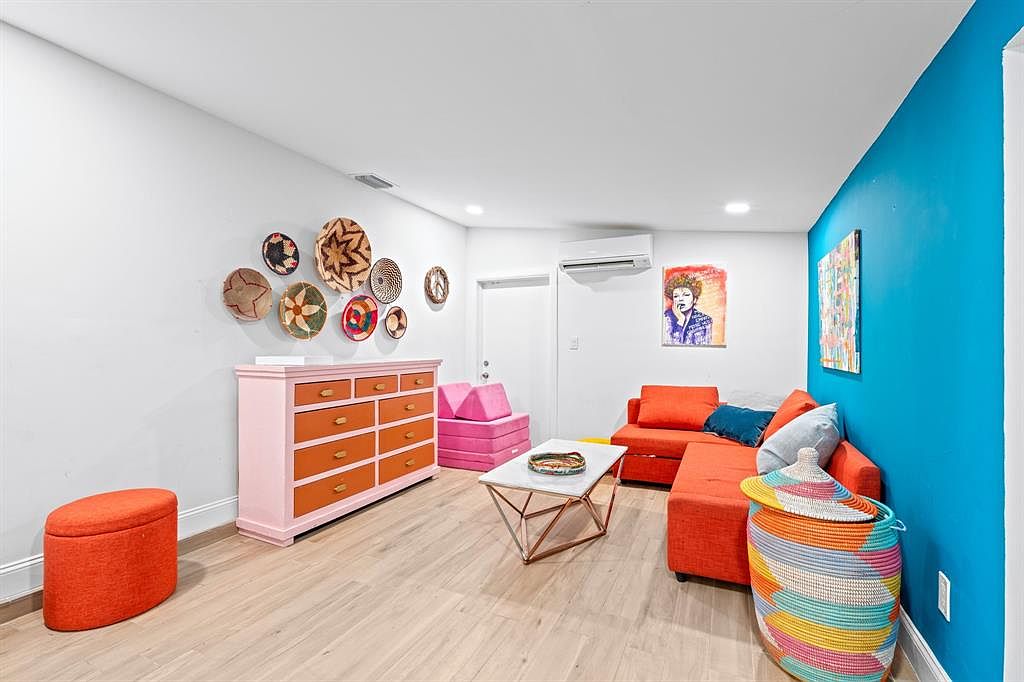 This vibrant playroom features a bright blue accent wall, immediately drawing attention with its bold color. A cozy orange sectional invites relaxation, accompanied by playful furniture like a pink storage box and colorful woven basket, perfect for toys. The light wood flooring creates a sleek contrast with the vivid hues, while an eclectic array of decorative baskets adorns the wall, adding texture and personality. A stylish pink and brown dresser combines functionality with charm, making it easy to store play items. This space is designed to be both inviting and functional, catering to family gatherings and children’s activities.