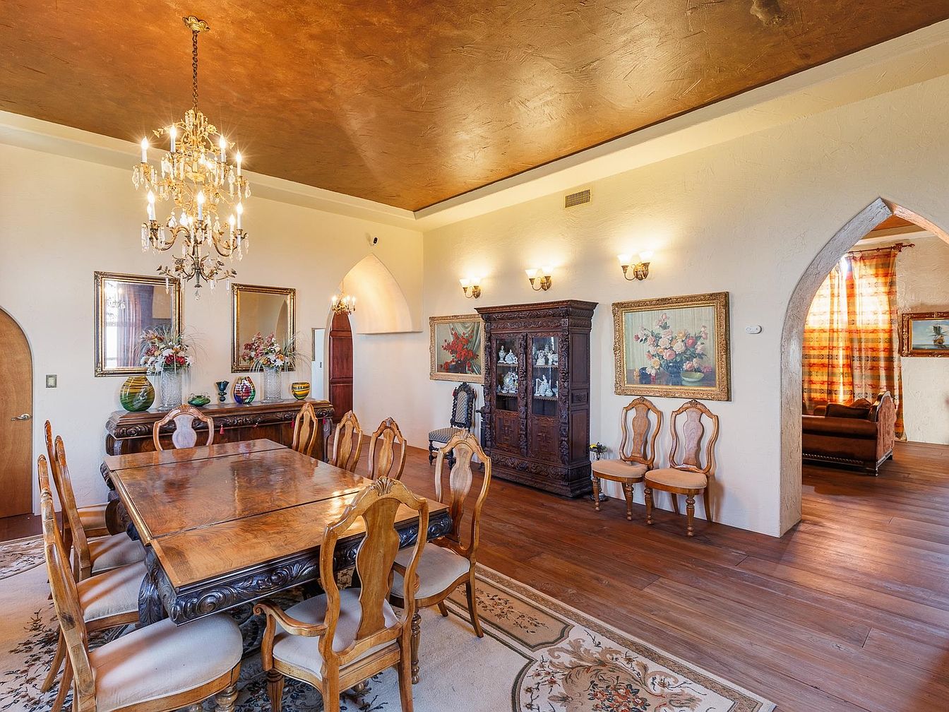 A grand formal dining room is designed for memorable family celebrations and gatherings, featuring a spacious wood dining table surrounded by carved chairs perfect for group meals. The room showcases warm, neutral walls that highlight ornate moldings and arched doorways for classic architectural interest. An elegant chandelier hangs above, casting a soft glow and enhancing the rich golden tones of the textured ceiling. Decorative cabinetry, detailed mirrors, and floral arrangements contribute to the room’s luxurious yet welcoming ambiance, while hardwood flooring and a large patterned rug provide durability and comfort for all ages, making it ideal for families.