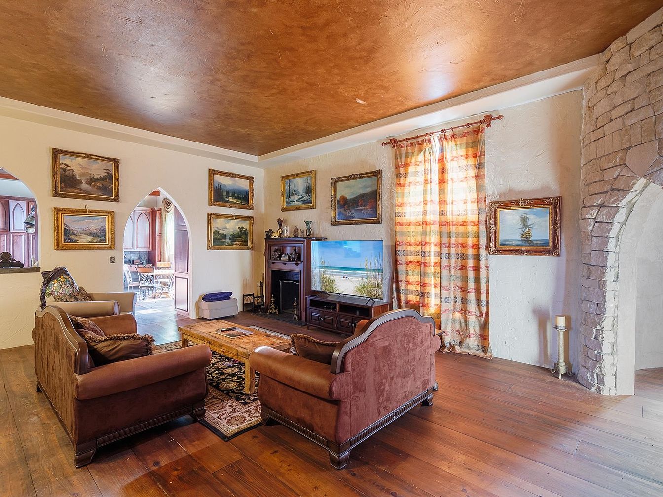 A cozy living room features a warm, inviting atmosphere with rich wooden floors and plush brown sofas arranged around a rustic wooden coffee table. The space is adorned with classic landscape paintings in ornate golden frames, adding an elegant and timeless touch. The walls have a textured, stucco finish, while a unique stone arch frames one side of the room. Arched doorways lead to adjoining spaces, creating an open flow perfect for family gatherings. The soft, golden ceiling and patterned drapes complement the overall color palette, making this an ideal spot for relaxation, conversation, and leisure activities.