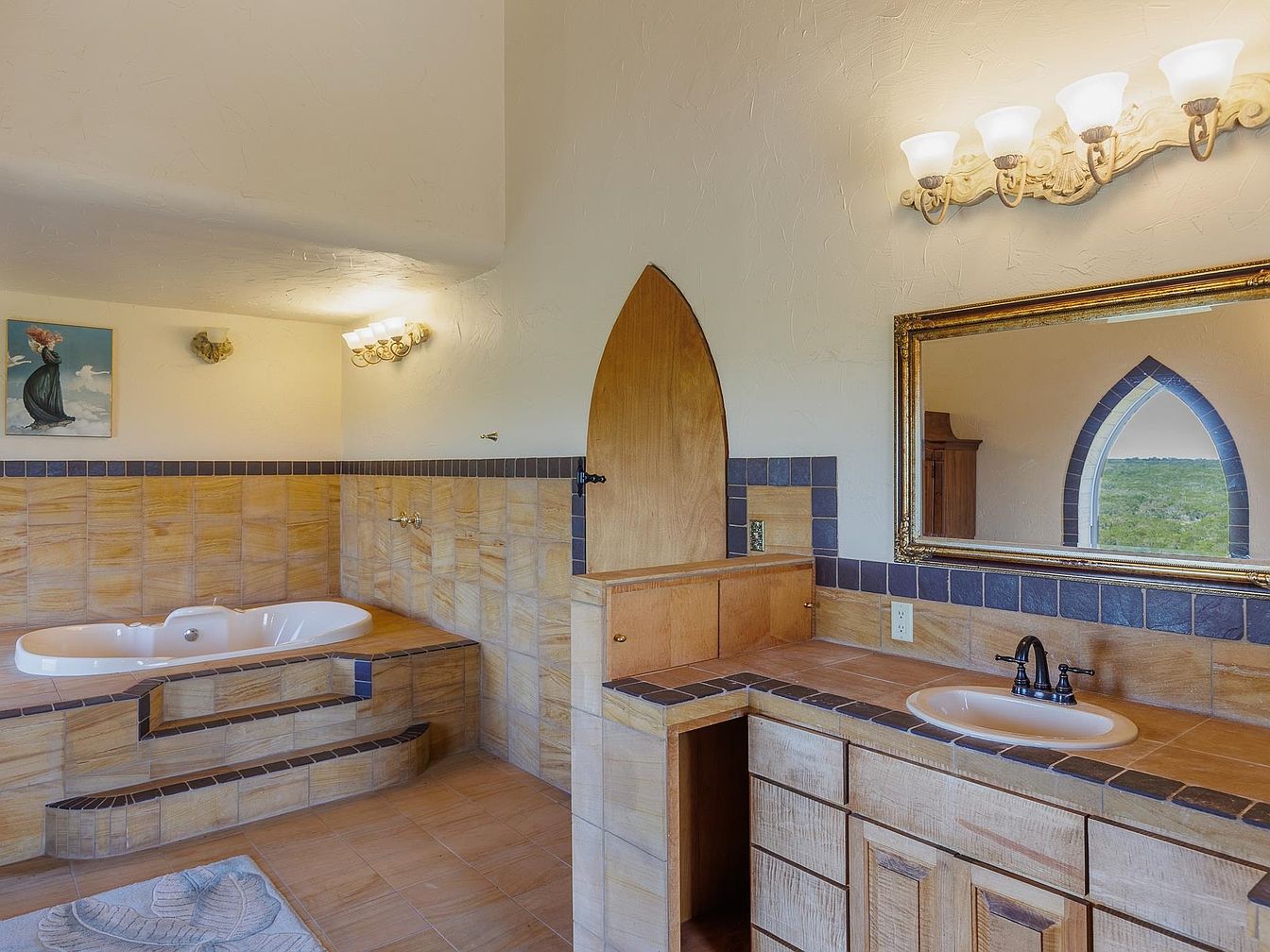 Warm earth tones and natural wood textures define this inviting bathroom, perfect for families and those seeking inspiration for a relaxing, practical space. The centerpiece is a built-in soaking tub with tile steps for easy, safe access, supported by a roomy vanity with ample cabinetry. A wide mirror, elegant light fixtures, and a unique arched niche add visual interest and character. Soft lighting and textured walls create a soothing ambiance, while sturdy tile and family-friendly fixtures ensure practicality. Subtle decorative accents, like the seashell bath rug and artwork, bring a personal touch to this harmonious, thoughtfully designed bathroom.