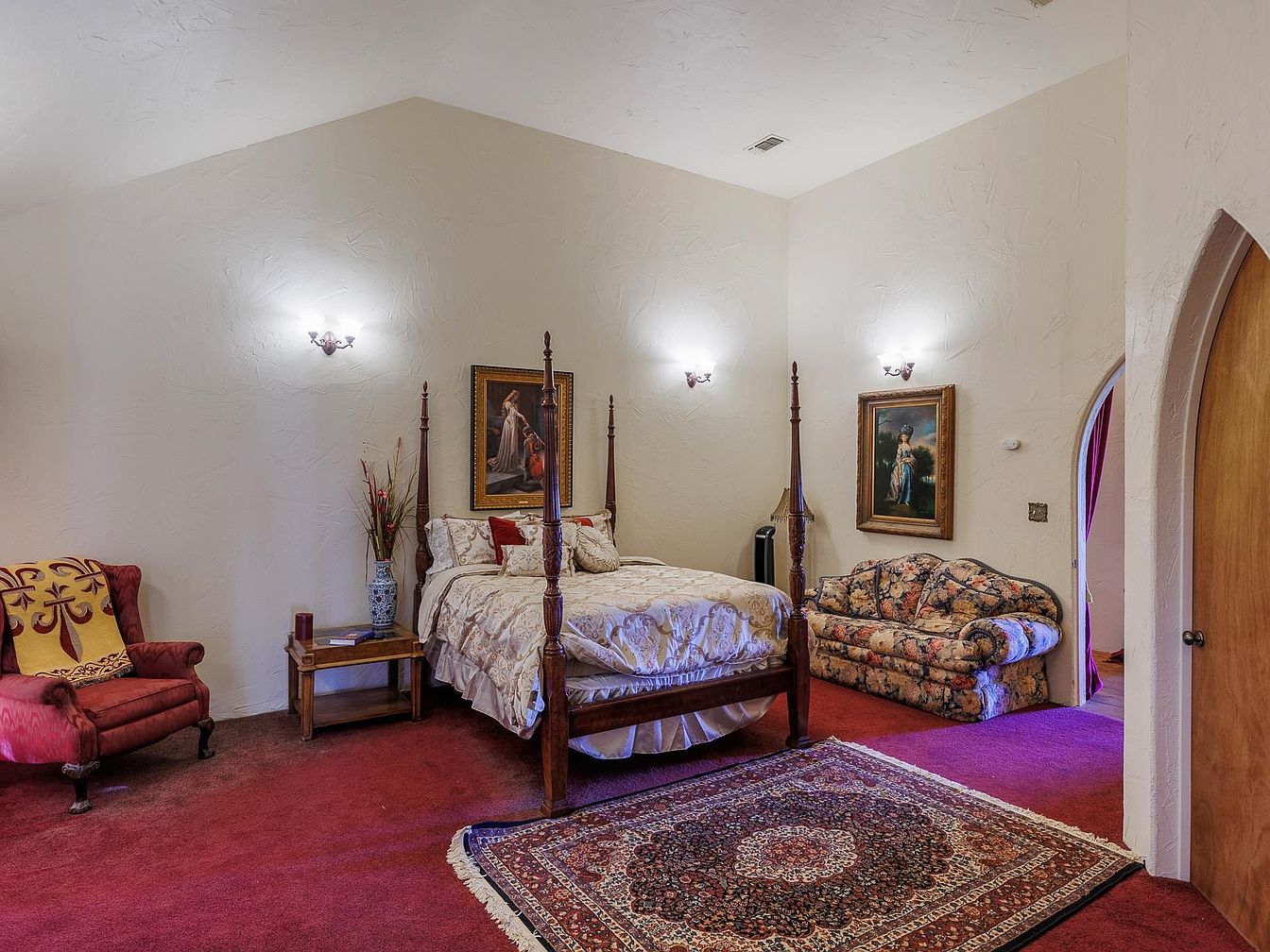 A spacious bedroom features a grand four-poster bed as its focal point, complemented by plush, richly colored carpeting and a detailed oriental area rug. The cream textured walls provide a soft backdrop, accentuated by classic wall sconces for warm, ambient lighting. Elegant portraits add an artistic touch above the bed and the floral-patterned settee, creating a sophisticated yet welcoming atmosphere. A velvet armchair with a patterned throw enhances the space’s comfort, perfect for quiet reading. An arched doorway and traditional wooden furniture introduce architectural charm, making the room ideal for family relaxation, offering style, comfort, and privacy.