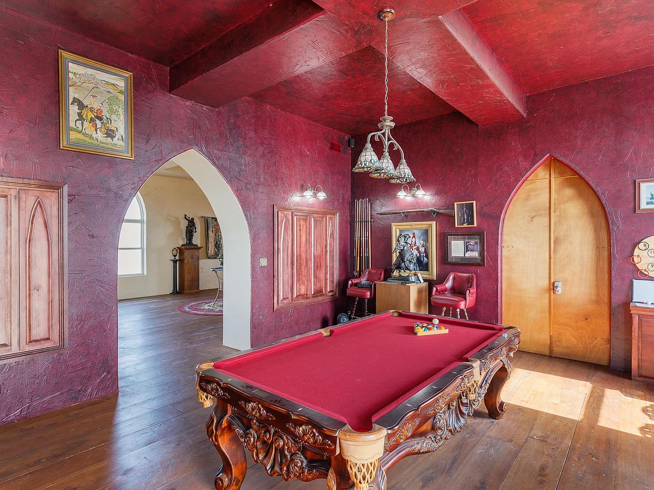 A striking game room features a luxurious carved wood pool table as its centerpiece, complemented by deep burgundy textured walls and ceiling that evoke a sense of classic sophistication. Gothic-inspired arched doorways and wall accents add unique architectural character, while rich wooden floors provide warmth and continuity. Two plush red armchairs and a cluster of wall art, including framed paintings and statues, create a cozy, inviting atmosphere suitable for both family gatherings and entertaining guests. Subtle, decorative lighting fixtures and ample natural light complete the room, making it a lively, family-friendly retreat for relaxation and play.