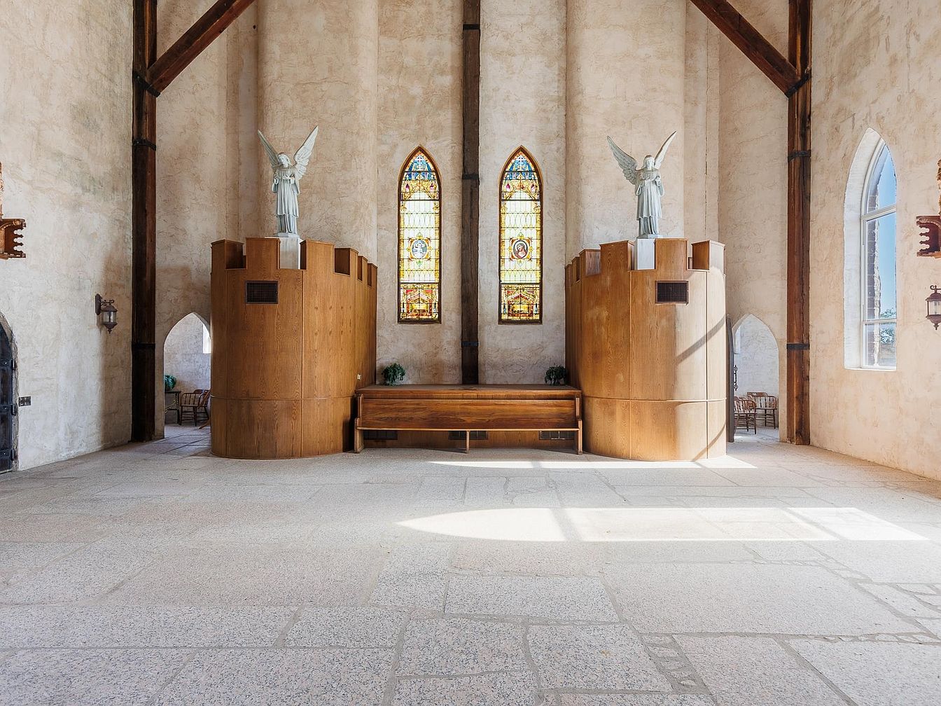 A grand, open space with soaring ceilings defined by exposed wooden beams and tall, textured plaster walls, evoking the majesty of a cathedral interior. Sunlight streams through intricate, stained-glass windows, casting colorful patterns onto the expansive stone flooring. Two unique wooden ramparts, each topped with angelic statues, serve as striking focal points flanking a central wooden bench, blending artistry with architectural interest. The neutral color palette of soft beige and warm wood tones promotes a calming, family-friendly environment. Large open doorways and cozy seating nooks suggest versatile gathering spots, making this room perfect for both intimate family moments and entertaining guests.