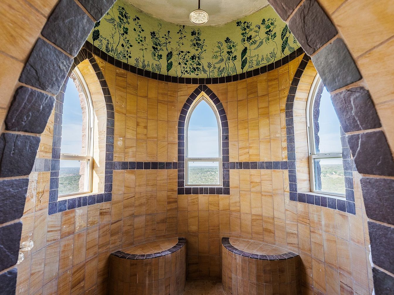 A cozy alcove with curved built-in benches creates a magical retreat, ideal for reading, relaxing, or family conversations. The room is encased in warm honey-hued tiles, accented with dark stone trim for a touch of medieval elegance. Tall, arched windows let in abundant natural light and offer stunning panoramic views, making this space both inspiring and family friendly. The ceiling features a whimsical botanical mural, drawing the eye upward and adding a soft, charming flair to the space. With its sturdy stonework and inviting layout, this spot is perfect for children and adults alike to gather and unwind.