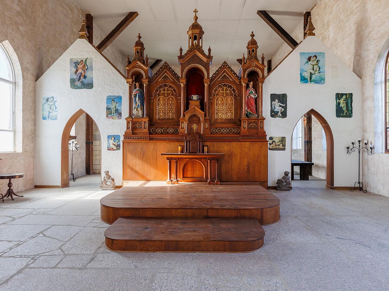 A grand foyer featuring a large, intricately carved wooden altar as the central statement, complemented by tall ceilings and large arched windows that flood the space with natural light. The pale stone walls lend a historic charm, adorned with classic angelic and saintly paintings offering an artistic and welcoming atmosphere. Neutral-toned floors in a stone pattern provide understated elegance, while decorative archways invite movement to adjoining rooms, making it ideal for gatherings. The symmetrical layout and use of warm wood details evoke a feeling of warmth and reverence, appealing to families seeking both community and inspiration in their home design.