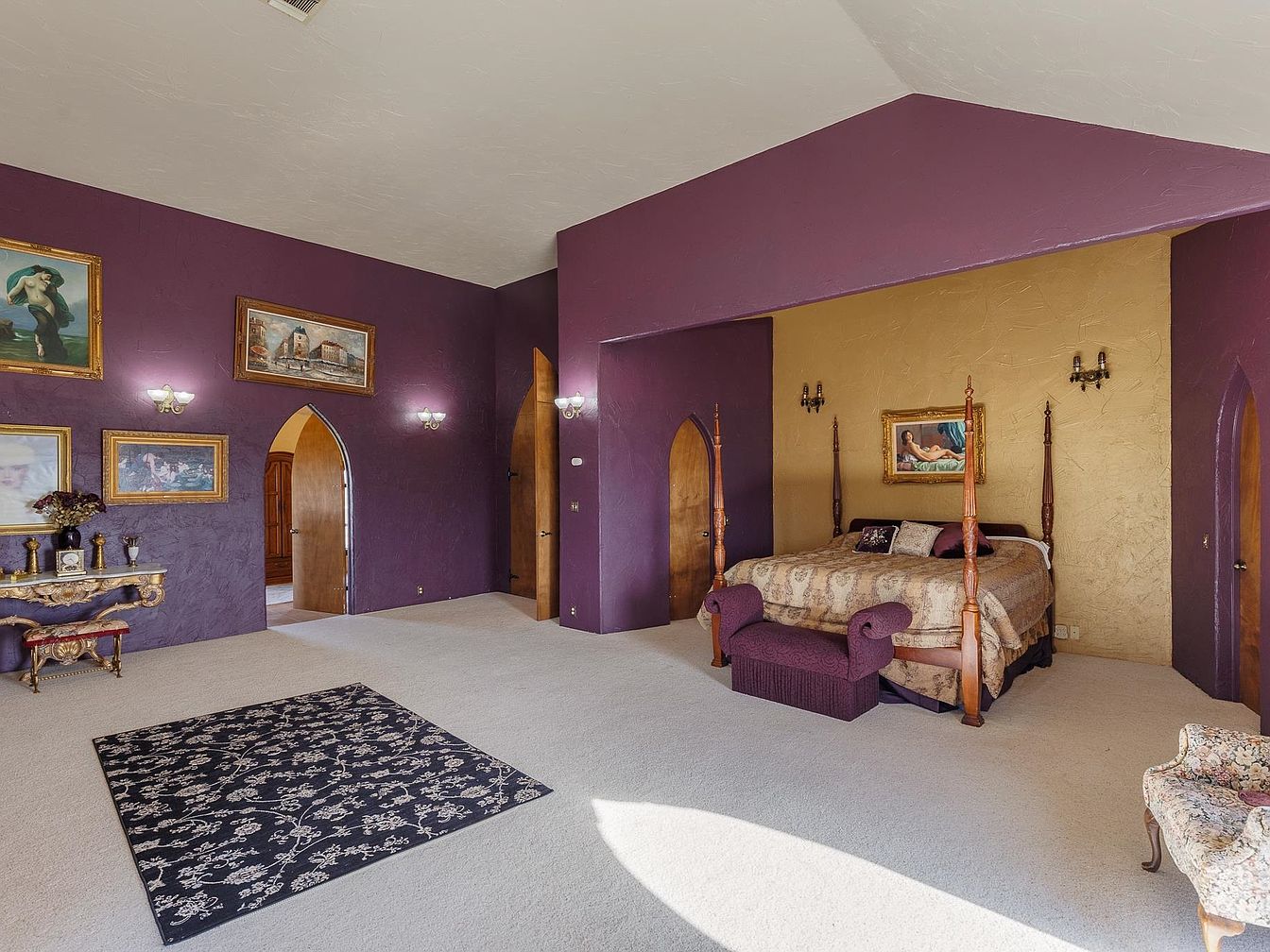 A spacious master bedroom features a stately vaulted ceiling and bold color palette with deep purple walls complemented by a textured gold accent wall behind the wooden four-poster bed. Family-friendly open space makes it easy for kids to enjoy time with parents, while soft, plush carpet provides comfort and warmth underfoot. Elegant arched doors and classic sconces add architectural interest, while curated artwork and decorative furnishings, like the settee at the foot of the bed and an ornate console table, create an inviting, luxurious atmosphere perfect for relaxation. Large windows allow for abundant natural light to fill the room.