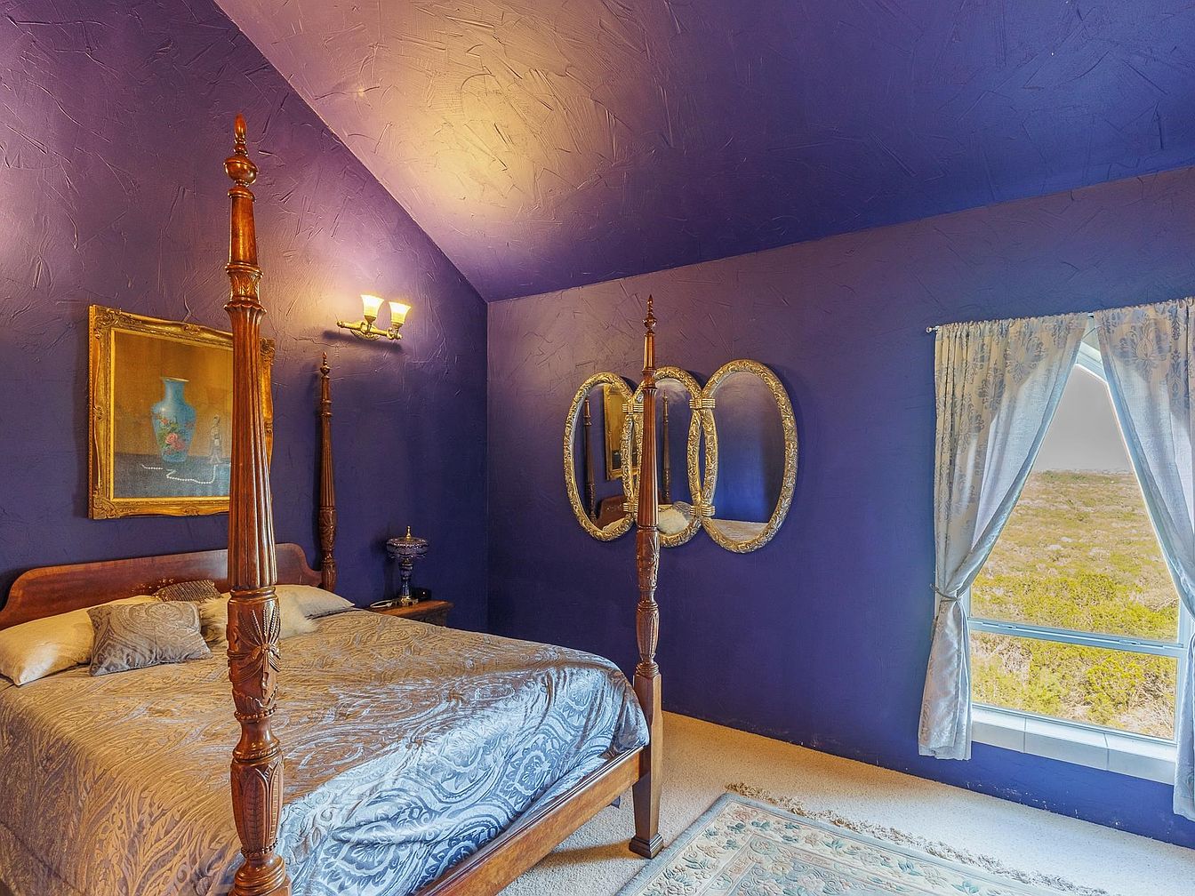 A tranquil primary bedroom featuring deep, regal purple walls and ceiling, creating a cozy, enveloping atmosphere. The room is anchored by a grand, carved four-poster bed dressed in patterned silver-blue bedding, paired with plush accent pillows for comfort and relaxation. A large picture window, framed with delicate blue-and-white curtains, invites natural light and offers serene views of the landscape. Ornate framed artwork and a trio of decorative mirrors add an elegant, personal touch, while soft lighting from the wall sconce enhances the room’s warmth. The soft, plush carpet underfoot makes it family-friendly and inviting for all ages.