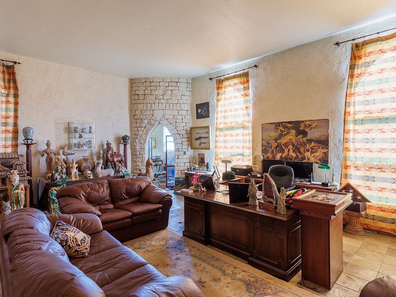 A cozy home office seamlessly blends productivity with relaxation, featuring a substantial wooden desk and a comfortable office chair positioned in front of a large computer monitor. Flanking the workspace, two soft brown leather sofas encourage family gatherings or casual work sessions. The room’s eclectic aesthetic merges classic and artistic touches; ornamental sculptures, curated antiques, and framed art add depth and interest. Cream-colored, textured walls and a unique stone archway lend a historic charm, while the striped curtains soften natural light. This office feels both lived-in and inviting, making it perfect for a family environment with ample space to work and unwind.