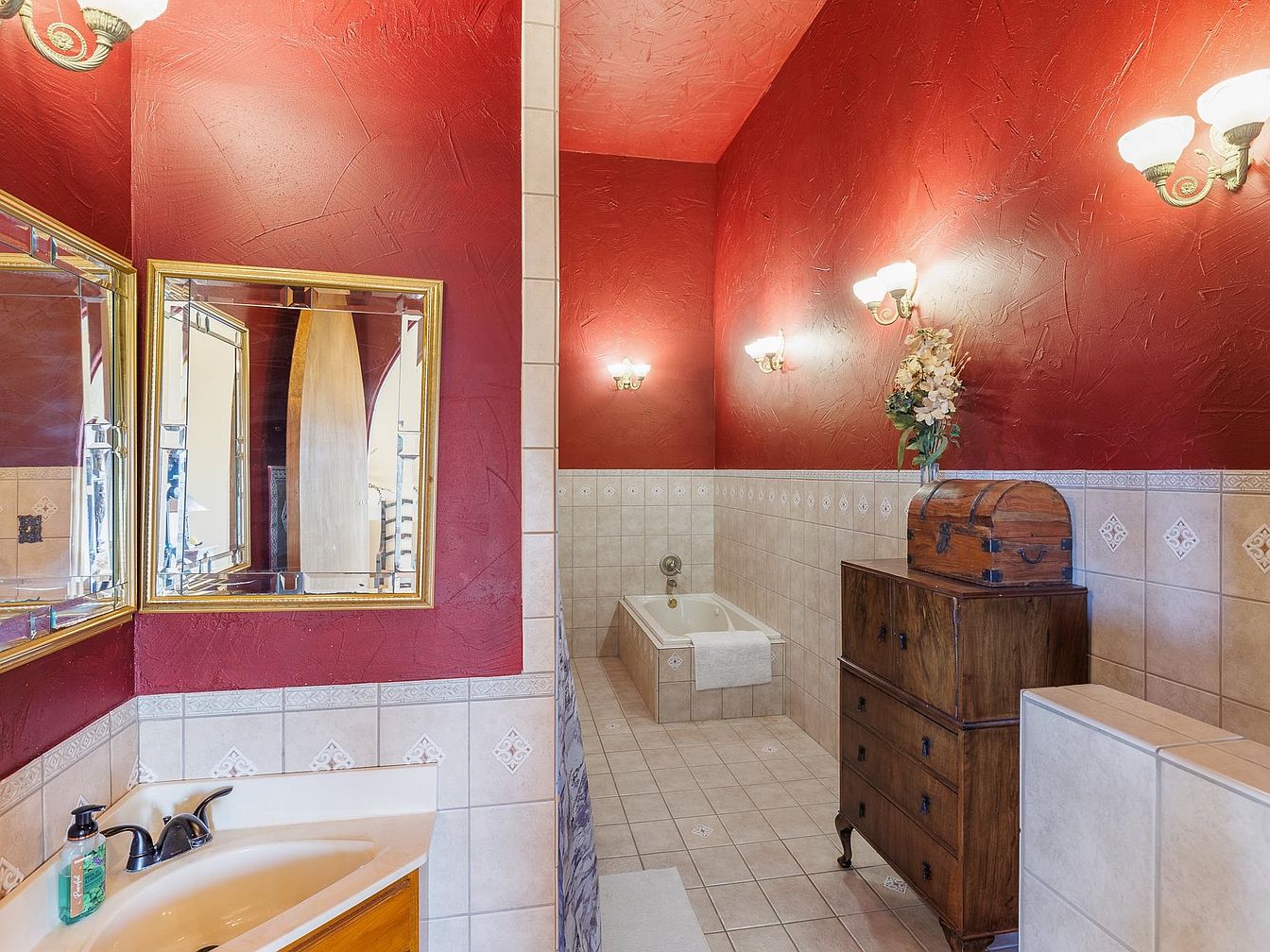 A luxurious bathroom featuring bold red textured walls combined with light beige and patterned ceramic tile for a dramatic and inviting look. The layout includes a deep soaking tub set against the far wall, ideal for family relaxation, and a spacious vanity with dual mirrors framed in gold for added elegance. Warm lighting from wall sconces enhances the cozy ambiance. Touches of old-world charm come from the antique wooden chest of drawers and decorative floral arrangement, blending storage and aesthetic appeal. The setup offers plentiful space for personal items, making it well-suited for busy families or guests alike.