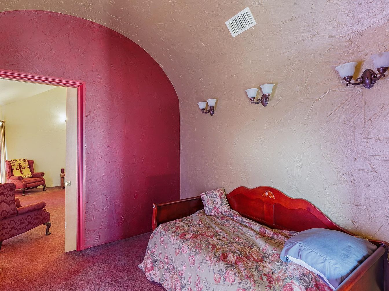 A cozy bedroom opens graciously into a bright sitting area, accentuated by a dramatic arched doorway painted in a deep burgundy hue. The room features textured plaster walls in soft beige, complemented by matching wall-mounted sconces that provide warm, ambient lighting. The floral bedspread and dark wooden daybed evoke a homey, vintage charm, perfectly suited for families seeking comfort and relaxation. Plush carpeting, continuing from the bedroom to the adjacent sitting space, creates a seamless flow. An inviting seating nook visible just beyond the doorway suggests spaces designed for both privacy and togetherness, making it ideal for family living.