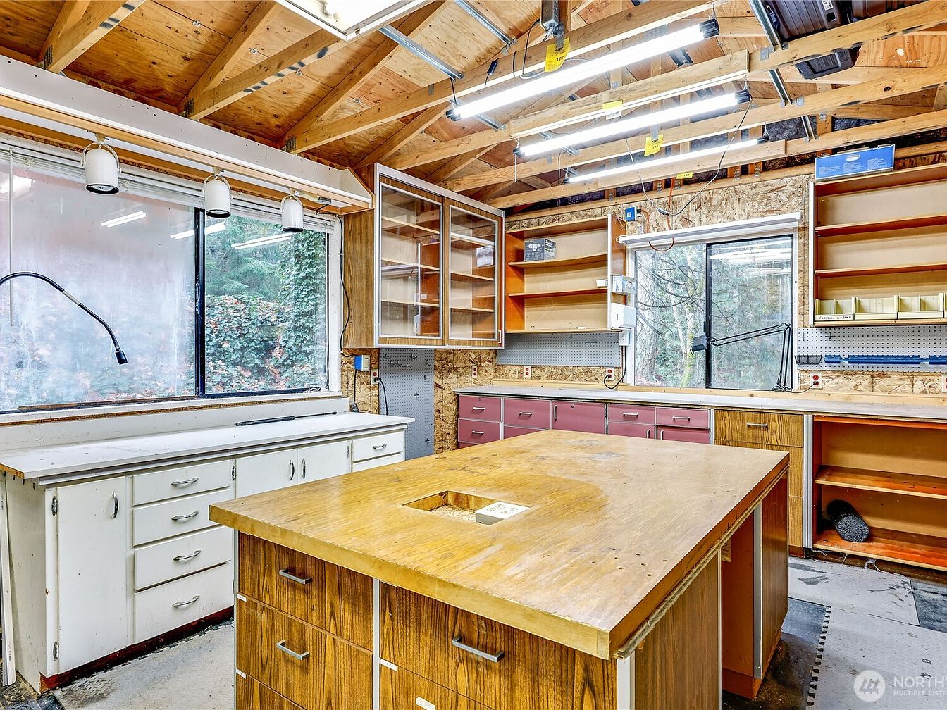 Spacious and highly functional woodworking or craft workspace featuring a large, central workbench ideal for family projects and hobbies. The area boasts open rafters and exposed beams, giving an industrial yet warm feel. Generous cabinetry in soft white and muted red tones provides abundant storage, while pegboard walls offer easy organization for tools. Two large windows flood the space with natural light, encouraging creativity and productivity. Overhead track and fluorescent lighting ensure the area remains well-lit, making it safe and welcoming for all ages. Ample counter space and durable surfaces make this workshop perfect for both adults and children to work side by side.