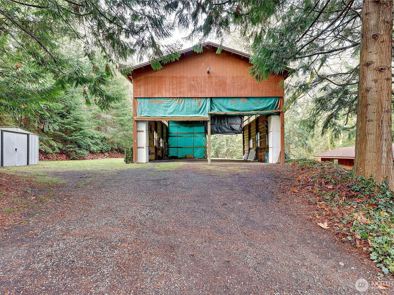 A large, rustic carport blends seamlessly into its woodland setting, surrounded by towering evergreens for privacy and natural shade. The structure features an open-sided design, ideal for accommodating multiple vehicles, recreational gear, or outdoor equipment. The upper section is sheltered by a warm cedar-toned exterior and green tarp accents, adding a hint of outdoorsy charm. Gravel paving ensures durability and easy maintenance, while a nearby storage shed offers extra space for tools or seasonal items. The open layout provides plenty of room for kids to play and explore, making it both functional and family-friendly.