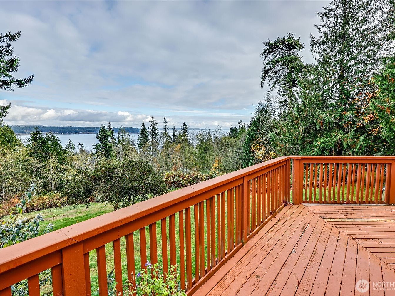 A spacious wooden deck overlooks a lush backyard and expansive forested landscape, with glimpses of water and blue sky beyond the trees. The deck’s warm reddish-brown hue contrasts beautifully with the greenery, creating a welcoming outdoor gathering spot for families. Built-in railings provide safety for children and peace of mind for parents, making it an ideal place for group meals or morning coffee. Surrounded by a mix of evergreens and open lawn, this area offers a serene transition between the home’s interior and nature, perfect for relaxation, play, and enjoying scenic views year-round.
