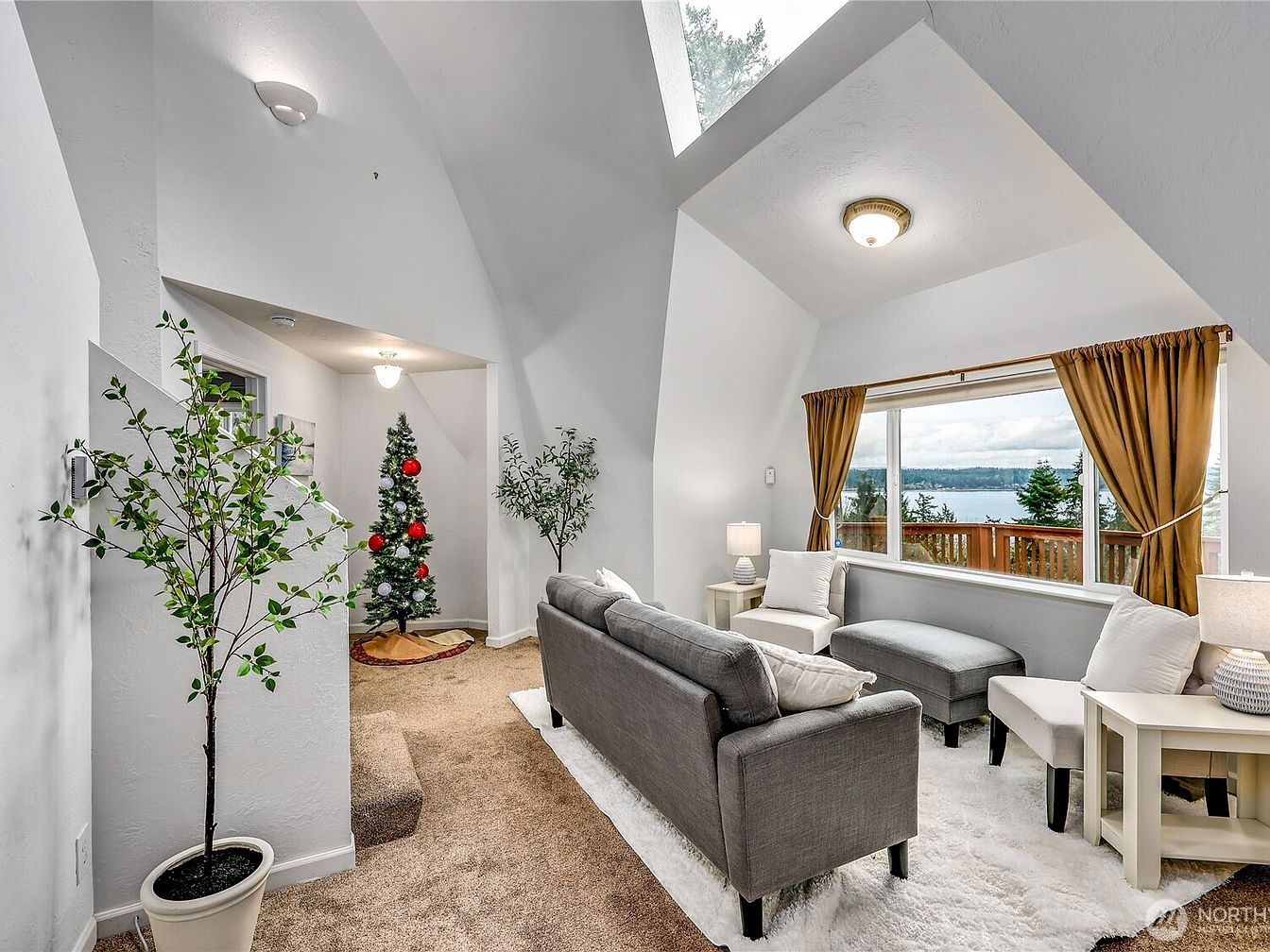 Bright and airy living room boasting high vaulted ceilings and large skylights, enhancing the open feel of the space. The layout features a comfy gray couch and accent chairs arranged on a plush white rug, with a soft ottoman for added flexibility. Golden-brown curtains frame expansive windows revealing a stunning lake view, filling the room with natural light. Family-friendly design elements include soft carpeting, accessible furniture, and festive touches such as a Christmas tree and potted plants for year-round appeal. Neutral wall colors create a calm backdrop, complemented by cozy lighting and modern, understated decor.