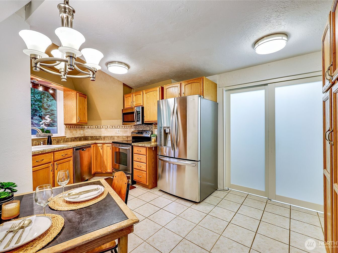 A warm and inviting kitchen features honey-toned wooden cabinetry paired with sleek granite countertops, creating a classic yet modern appeal. The L-shaped layout maximizes cooking space and includes stainless steel appliances for contemporary convenience. A cozy eat-in corner with a small table set for two fosters casual family meals. Large frosted glass sliding doors flood the room with soft, natural light while offering privacy. Neutral tile flooring and a stylish light fixture complete the family-friendly design, making this area both functional and welcoming—a perfect spot for bustling mornings or relaxed weeknight dinners.