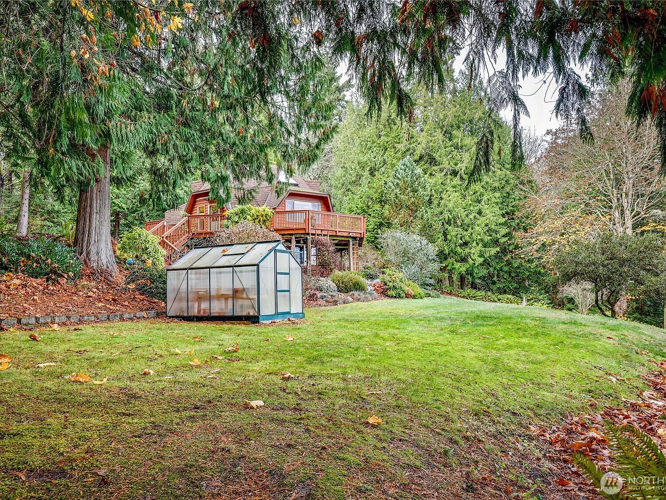 A spacious backyard nestled beneath towering evergreens provides a tranquil retreat for outdoor living and play. The wide expanse of lawn, bordered by natural stone and vibrant landscaping, invites children to run freely while parents enjoy the peaceful scenery. A charming elevated wooden deck stretches along the rear of the house, perfect for family gatherings or quiet morning coffee with views of the garden. A small greenhouse stands ready for homegrown vegetables or flowers, offering a family-friendly environment to nurture both plants and curiosity. The color palette is a harmonious blend of soft greens, earthy browns, and natural wood textures.