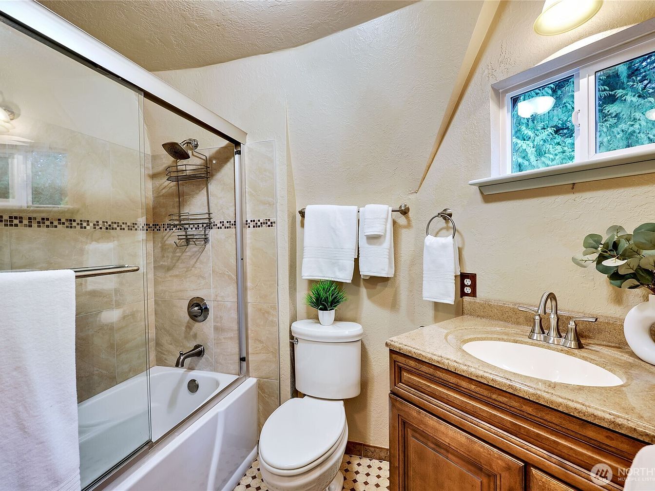 A cozy bathroom features neutral tones with warm beige walls and classic ceramic tile flooring, offering a soothing and inviting atmosphere. The space is efficiently arranged with a wood vanity topped by a stone sink countertop, complemented by brushed nickel fixtures and a mounted mirror. A combination tub and shower has a sliding glass door and modern tile accents, making it practical for both kids and adults. Family-friendly touches include multiple towel racks, organized shelving in the shower, and easy-to-clean surfaces. A small window above the sink brings in natural light, highlighting fresh greenery for an uplifting finishing touch.