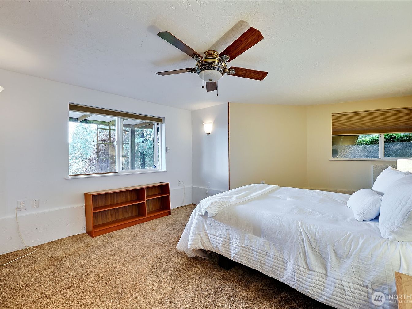 Spacious primary bedroom featuring expansive windows that fill the room with natural light, creating a welcoming and airy environment perfect for relaxing or spending time with family. The room is anchored by plush, warm-toned carpeting, providing comfort and a child-friendly surface for play. A contemporary ceiling fan lends a touch of classic elegance and ensures year-round comfort. The minimalist design is complemented by crisp white walls and a cozy neutral accent, while the practical built-in shelving offers extra storage for books or toys. Clean architectural lines and soft lighting make this an inviting and tranquil haven.