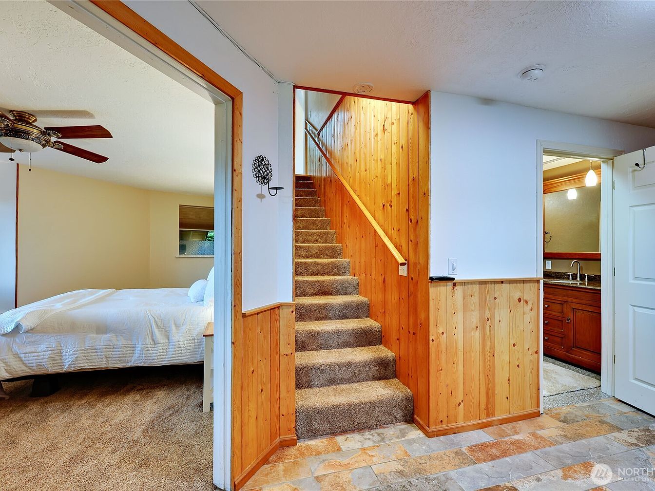 A central hallway features a staircase flanked by warm wood paneling and beige carpet, seamlessly connecting the lower and upper levels. To the left, a cozy bedroom with plush carpeting and soft neutral tones invites relaxation while a ceiling fan ensures year-round comfort. The hallway’s tile flooring adds durability and is ideal for families with kids and pets, while the nearby bathroom offers convenient access for busy mornings. Natural wood accents create a welcoming atmosphere, blending rustic charm with modern function—a perfect transitional area that feels both open and family friendly, promoting easy movement throughout the home.