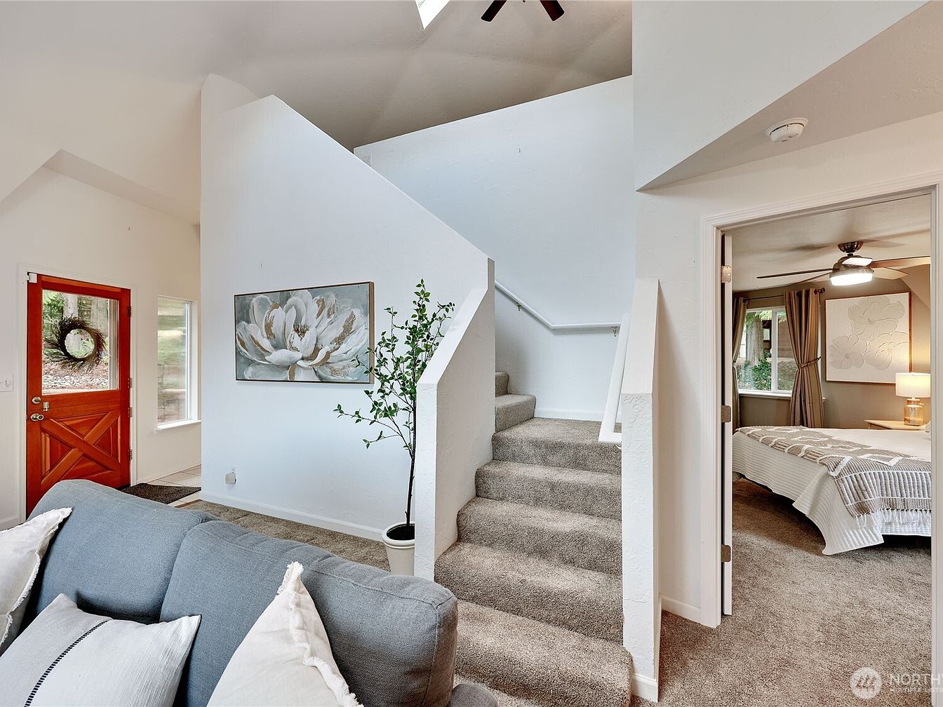 A bright and welcoming entryway is paired with a plushly carpeted staircase, seamlessly connecting the home’s living spaces. A coral-red Dutch door adds a pop of color, echoing warmth and inviting natural light which flows in through an adjacent window. Soft neutral walls create an airy, open feel, accentuated by a serene floral painting and a potted plant that adds life to the decor. The open layout provides visibility into the cozy bedroom, perfect for families keeping an eye on little ones. Soft gray carpeting throughout enhances comfort and safety, ideal for children and pets alike.