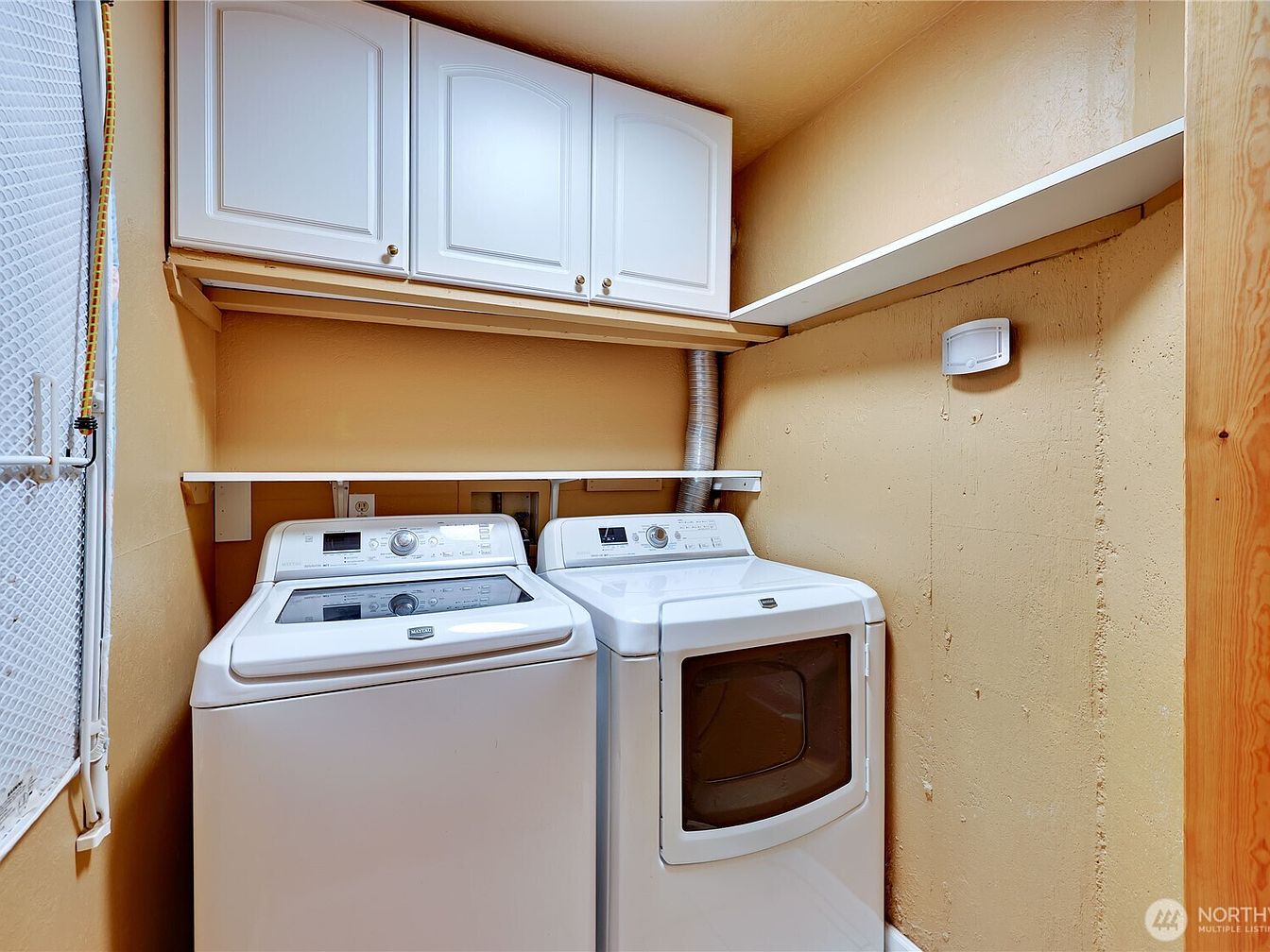 A practical and compact laundry room designed for family convenience, featuring a side-by-side washer and dryer setup beneath ample white overhead cabinetry. The neutral tan walls create a warm, inviting atmosphere while a white open shelf above the appliances provides extra space for organizing laundry supplies. Clean lines, simple fixtures, and easy-to-clean surfaces enhance functionality, making chores efficient. The design supports busy households needing organization, offering both enclosed storage and accessible shelving. The space is well-lit, maximizing visibility and comfort for multitasking. Durable appliances and sensible storage contribute to a tidy, stress-free laundry experience the whole family will appreciate.