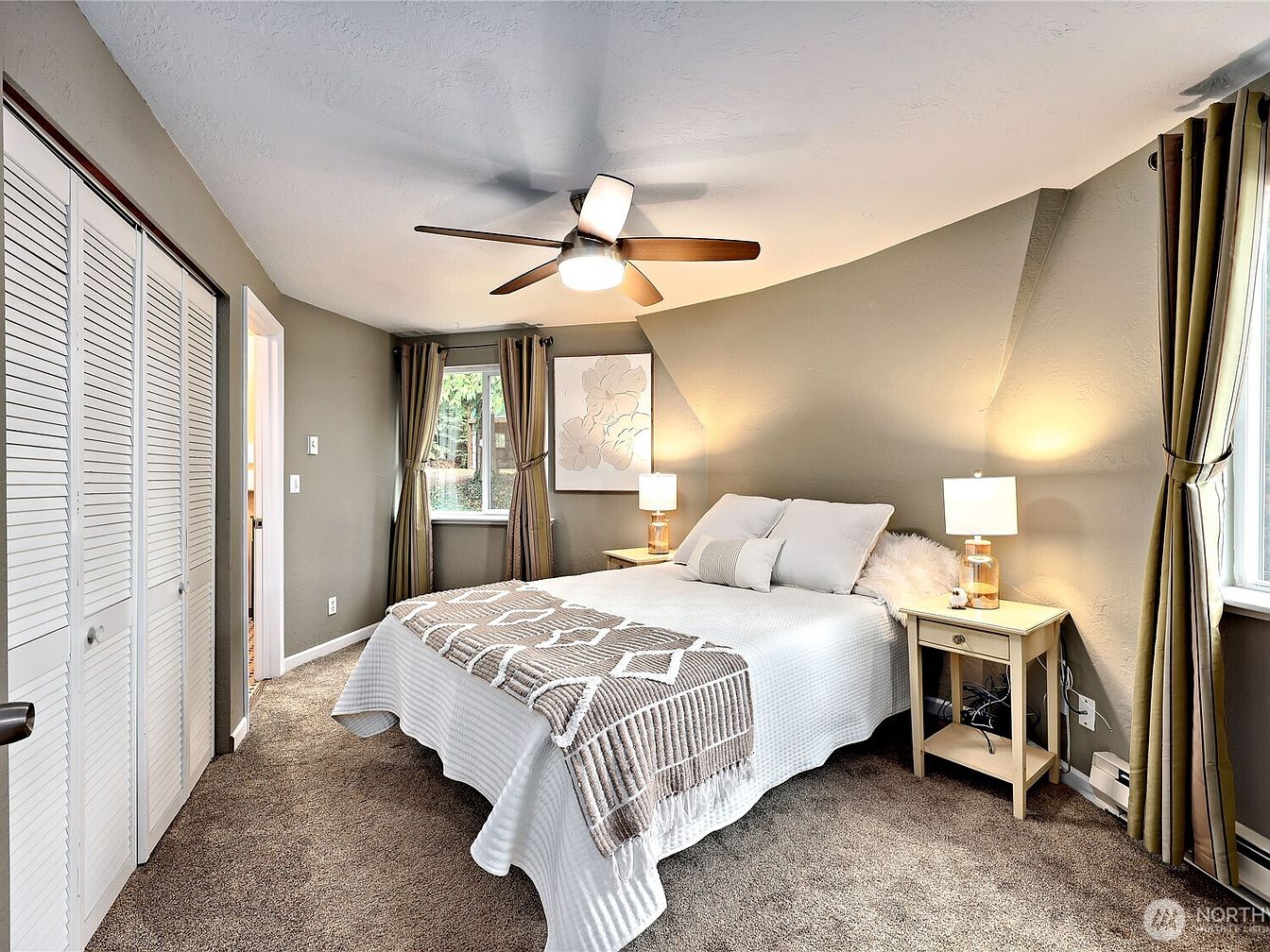 This warm and inviting bedroom features a neutral color palette with soft beige walls and deep brown carpeting, creating a serene and restful atmosphere. A queen-sized bed is dressed in crisp white linens and accented with patterned throws and plush pillows for extra comfort. Dual nightstands with sleek table lamps provide balanced lighting and surface space for nighttime essentials. Large windows are framed by floor-length drapes, welcoming natural light while offering privacy. Thoughtful touches like closet storage, a ceiling fan for air circulation, and gentle artwork above the bed make this space both functional and family friendly, perfect for relaxation.