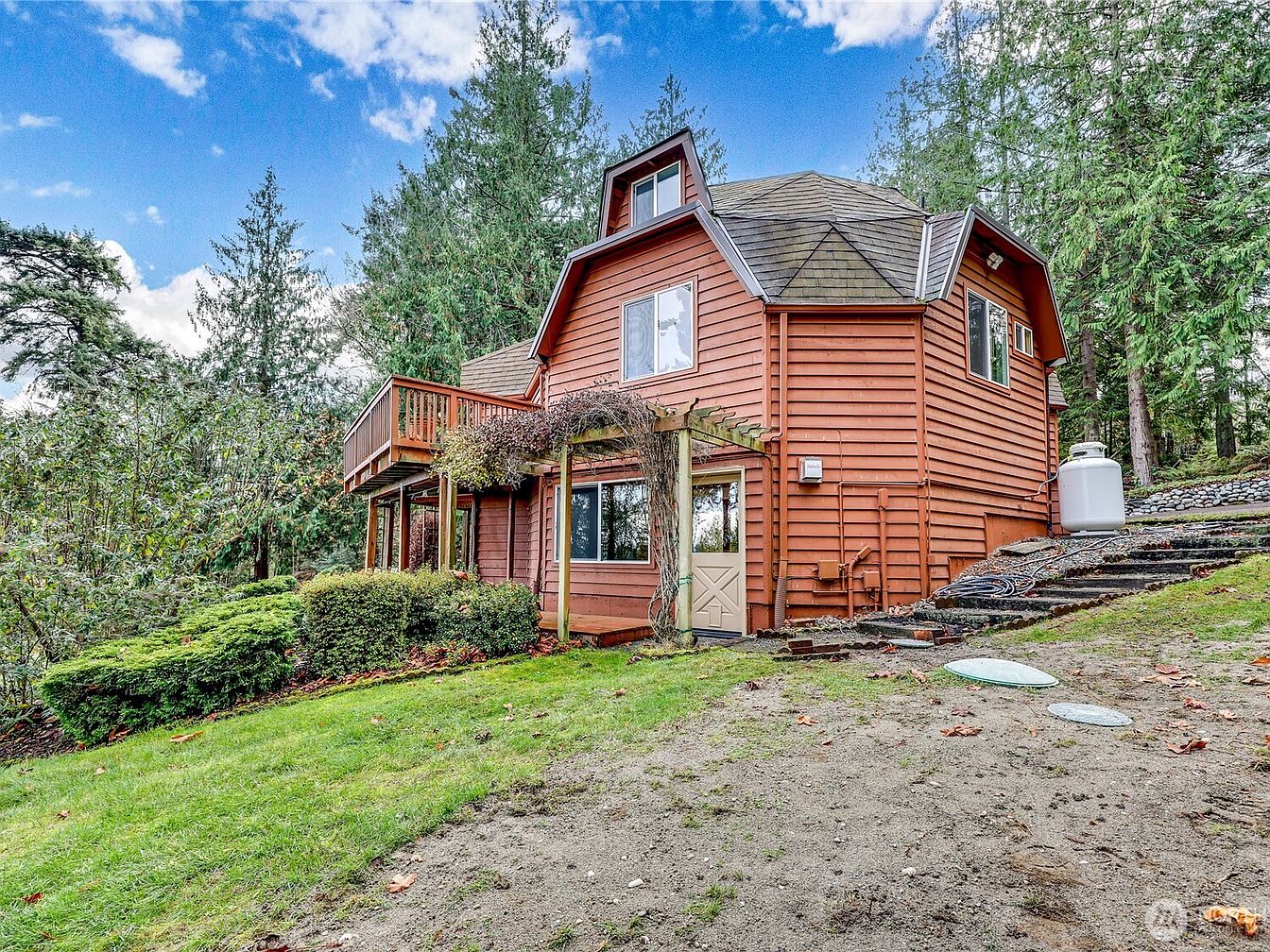 A charming two-story home features warm cedar siding and a unique gabled roof, set against a backdrop of towering evergreens. The backyard offers a spacious lawn perfect for children to play and for family gatherings. Large windows bring natural light into the house, while a pergola entwined with greenery provides shade and rustic elegance to the back entry. An elevated wooden deck offers outdoor living space ideal for barbecues and relaxing. The landscaping is thoughtfully designed with trimmed shrubbery and gentle slopes, inviting exploration and outdoor fun for all ages. This serene retreat beautifully blends architecture with its natural forest surroundings.