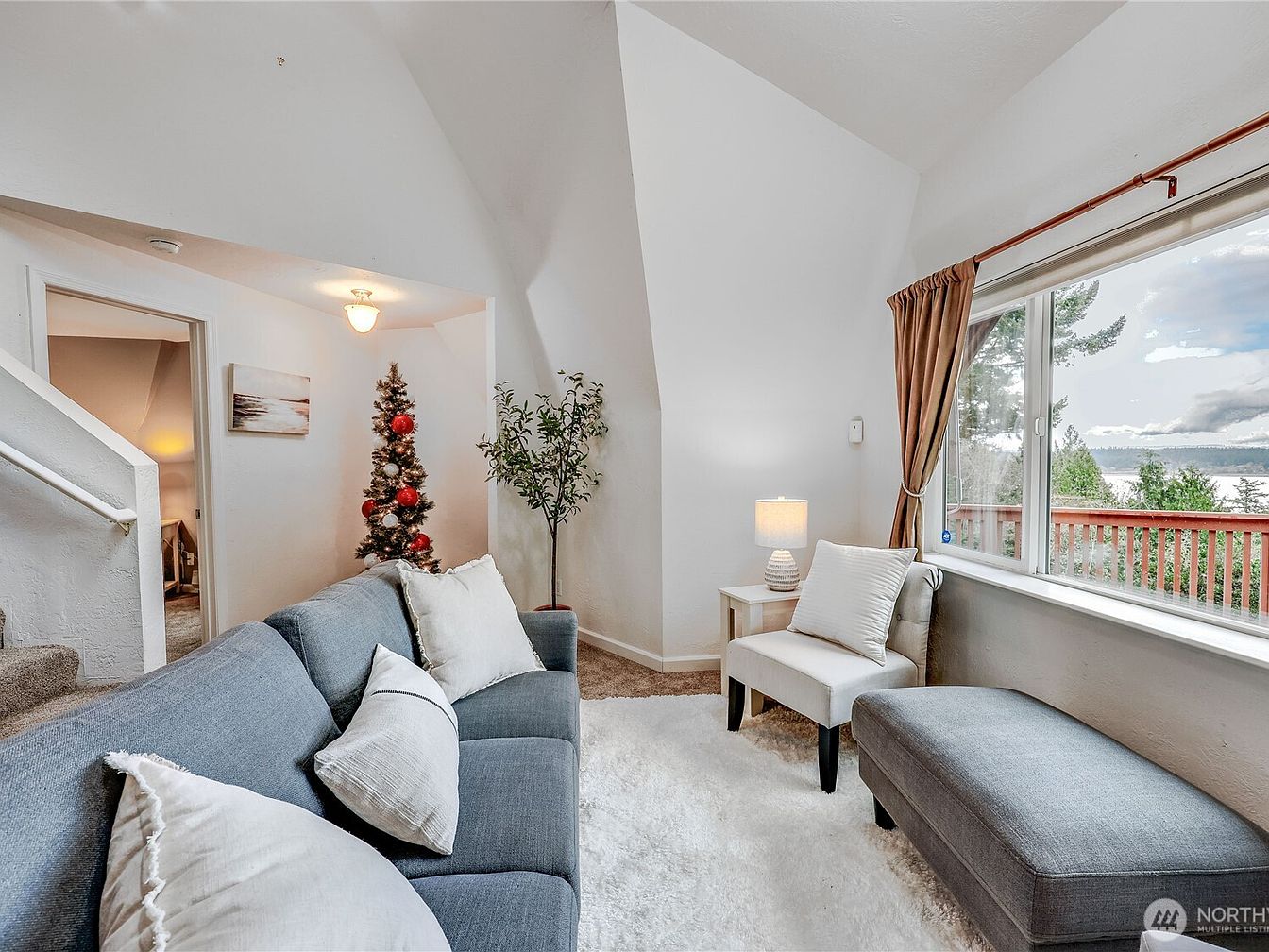 This inviting living room nook is filled with natural light from expansive windows that offer scenic views of the backyard and surroundings. The space combines comfort and style with a plush gray sectional sofa, crisp white accent pillows, a soft white area rug, and a sleek armchair paired with a matching ottoman. The neutral color palette creates a calming atmosphere, while touches like a potted plant and a tastefully decorated Christmas tree add warmth and family-friendly flair. The open layout encourages relaxation and conversation, making it ideal for gatherings or quiet afternoons overlooking nature.