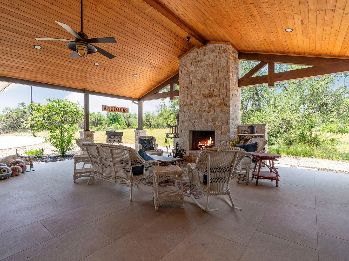 A spacious covered patio showcases a rustic yet elegant outdoor living area perfect for family gatherings or relaxing evenings. The warm, wood-paneled ceiling contrasts beautifully with the stone fireplace, which acts as a cozy focal point. White wicker seating surrounds a central area rug, providing comfortable spots for adults and children alike, while the open layout invites easy conversation and connection. Neutral tile flooring enhances the airy, inviting atmosphere, complemented by a gentle, natural color palette. Decorative accents, like vintage signs and locally-inspired pieces, inject character and charm, making this an ideal space for entertaining or enjoying nature views.