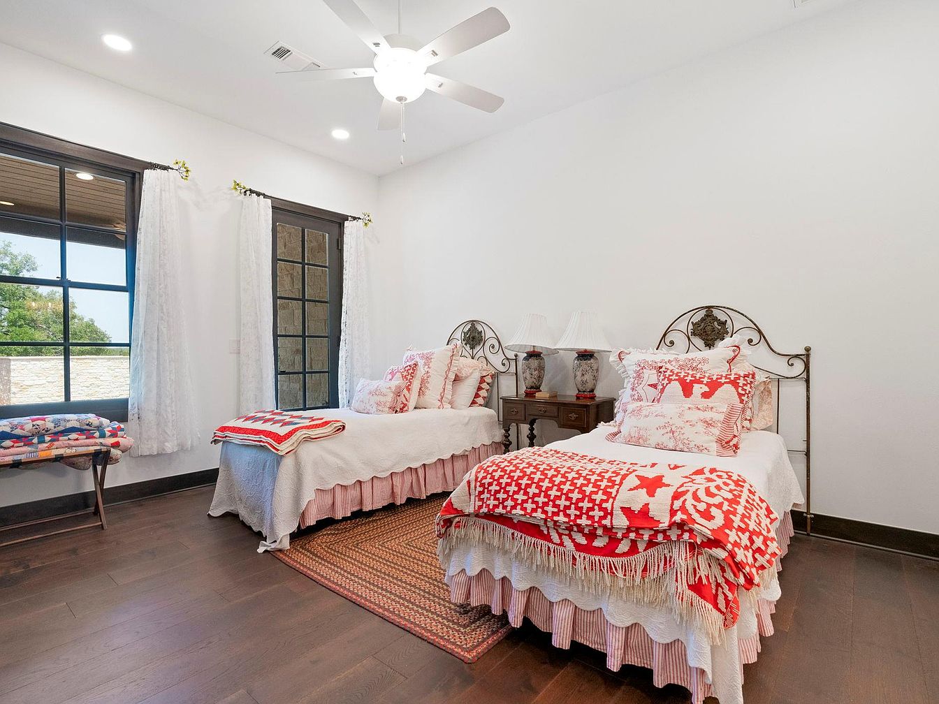 This inviting bedroom features two twin beds adorned with coordinated red and white patchwork quilts and frilled bed skirts, creating a cozy and playful environment for children or guests. Large windows with sheer curtains allow abundant natural light while offering views of the outdoors, making the space bright and cheerful. A classic wooden nightstand rests between the beds, topped with elegant matching lamps for nighttime reading. The dark wood flooring and neutral walls provide a warm contrast to the lively bedding, and a woven area rug ties the space together. The room’s open layout offers plenty of space for play and relaxation.