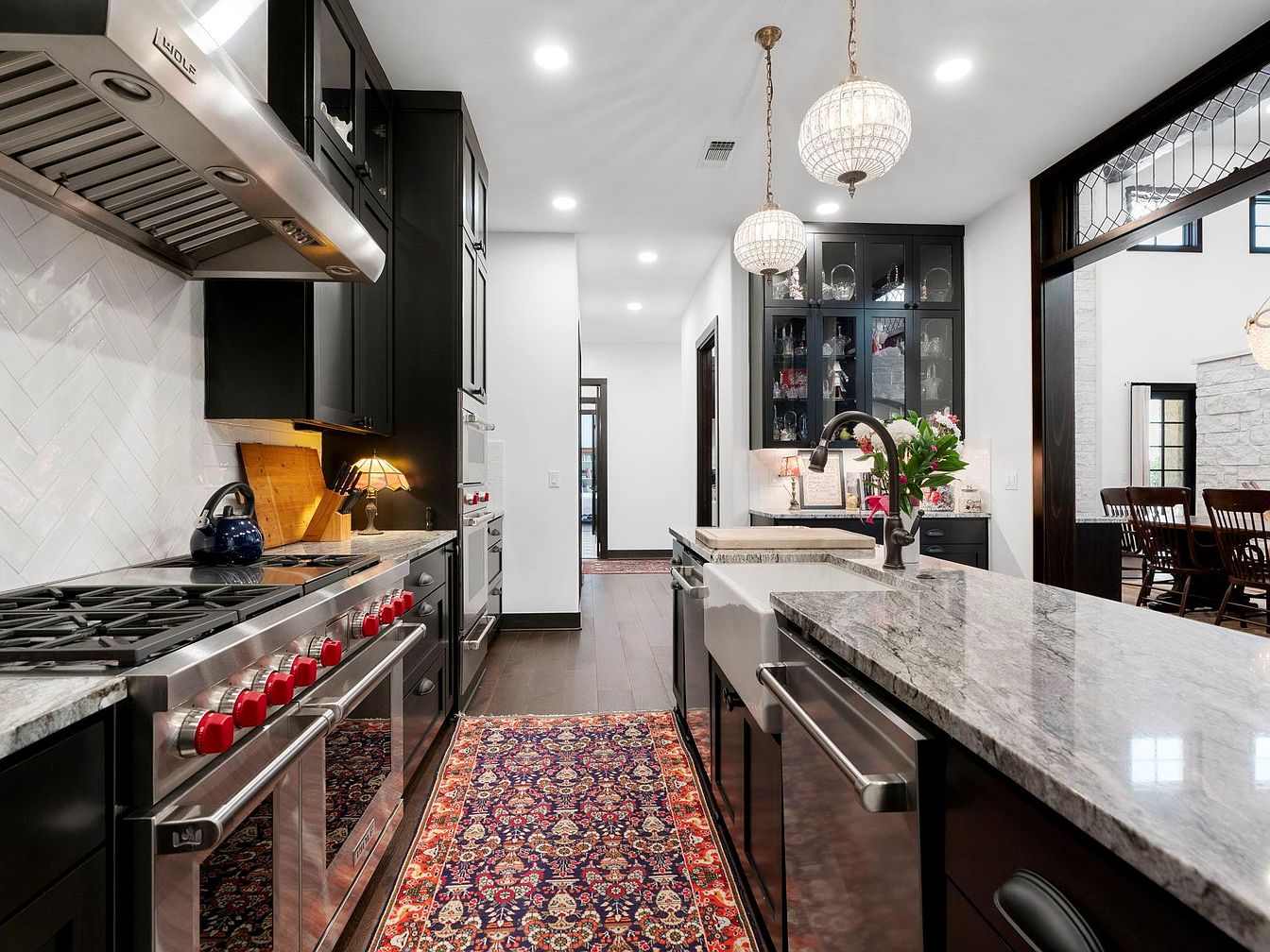 A luxurious kitchen designed for both beauty and function, featuring sleek black cabinetry and gleaming marble countertops. The statement range with bold red knobs and a spacious farmhouse sink make this the heart of any family home. Glass-front cabinets display fine glassware while providing easy access for family gatherings. Vintage-inspired pendant lights illuminate the island, complemented by a colorful oriental runner adding warmth and personality. Open to the dining area, this kitchen encourages togetherness, making it ideal for hosting and everyday living. The herringbone tile backsplash and modern appliances complete the balance between classic elegance and contemporary comfort.