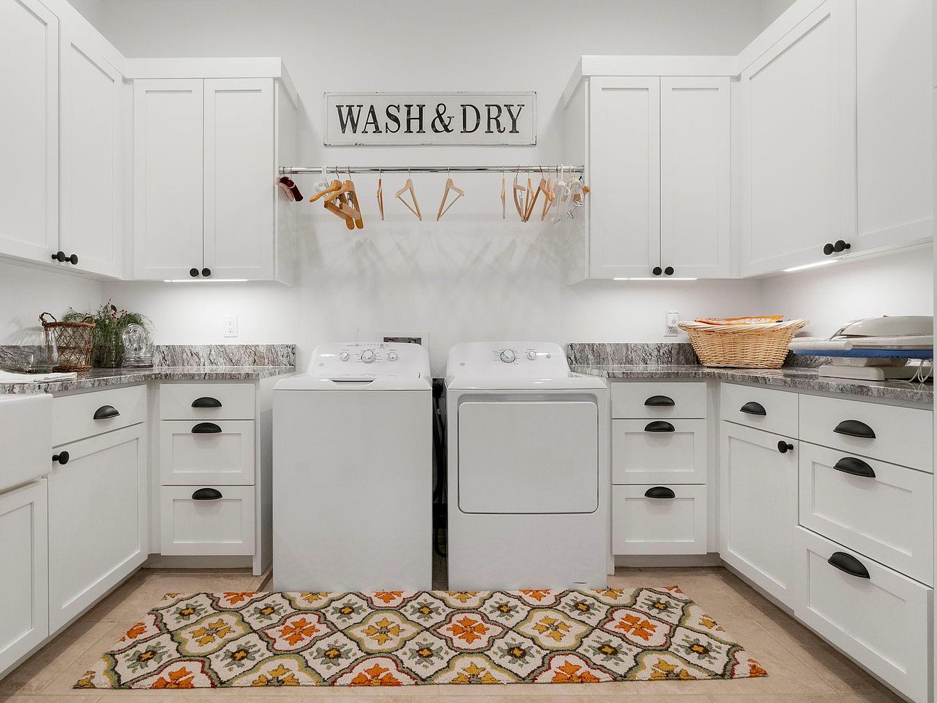 A bright and welcoming laundry room features crisp white cabinetry with black hardware, providing ample storage and a clean, modern look. A pair of classic white washer and dryer units sit side by side beneath a charming “WASH & DRY” sign, while a marble-look countertop wraps three walls for folding and sorting laundry. An under-cabinet rod holds wooden hangers for air-drying delicate items. The room’s playful character is enhanced by a colorful patterned rug, and a woven wicker basket and glass jar add warm, homey touches. The layout maximizes both work surface and organization, making it family friendly and efficient.